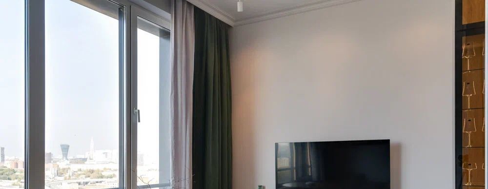 Уютная студия на 16-м этаже с панорамным остеклением и потолками 3 метра. Главное преимущество — захватывающий вид на Москву-реку, который открывается прямо из окна.