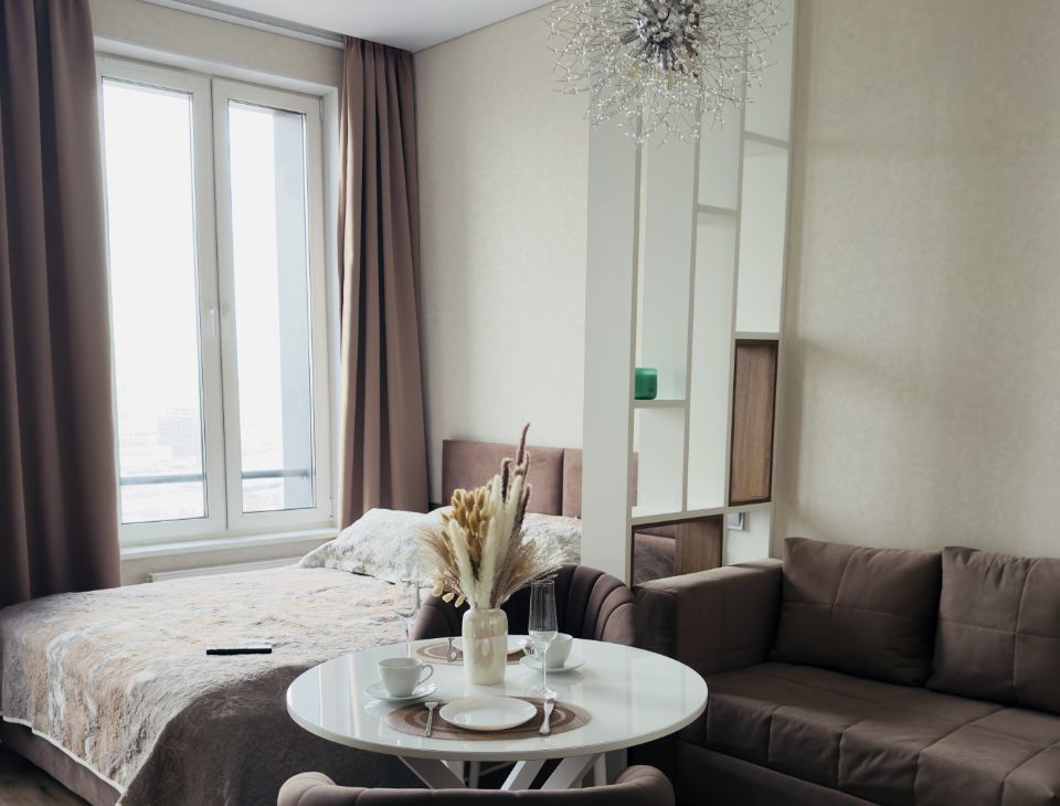 Сдаётся просторная студия с дизайнерским ремонтом в ЖК бизнес-класса "Сердце столицы".Студия полностью меблирована и оснащена всеми удобствами для комфортного проживания: