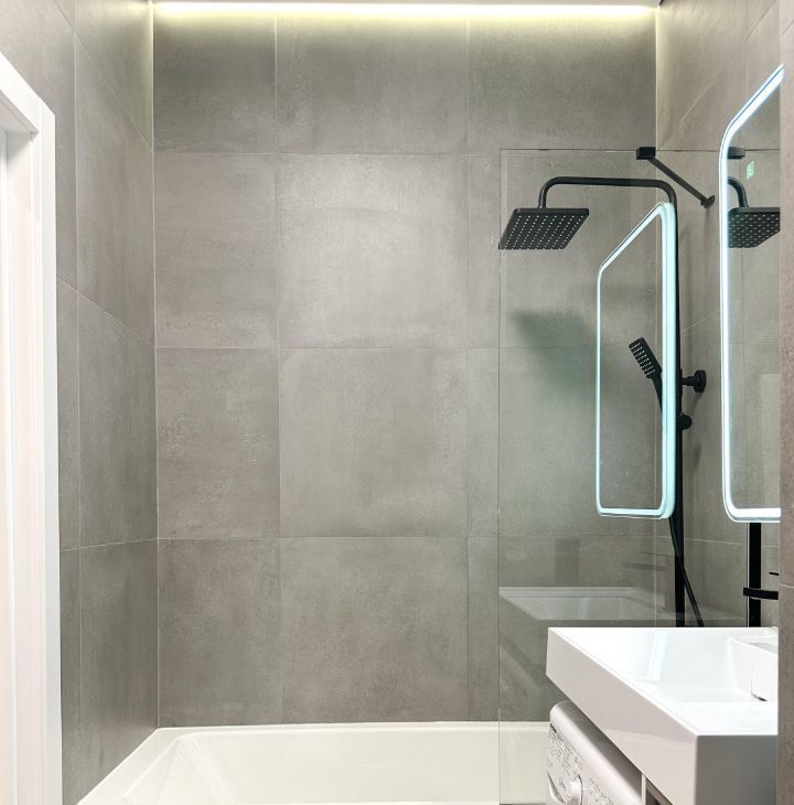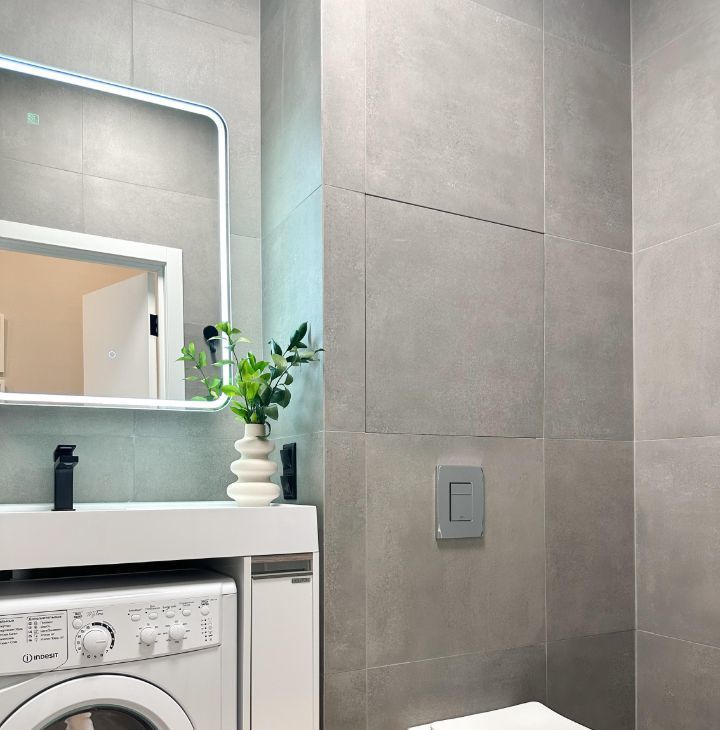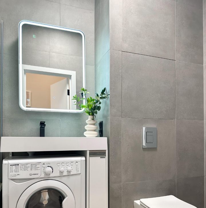 - Светлая ванная комната с современной техникой.