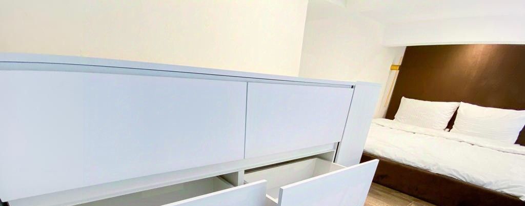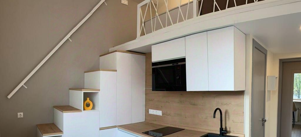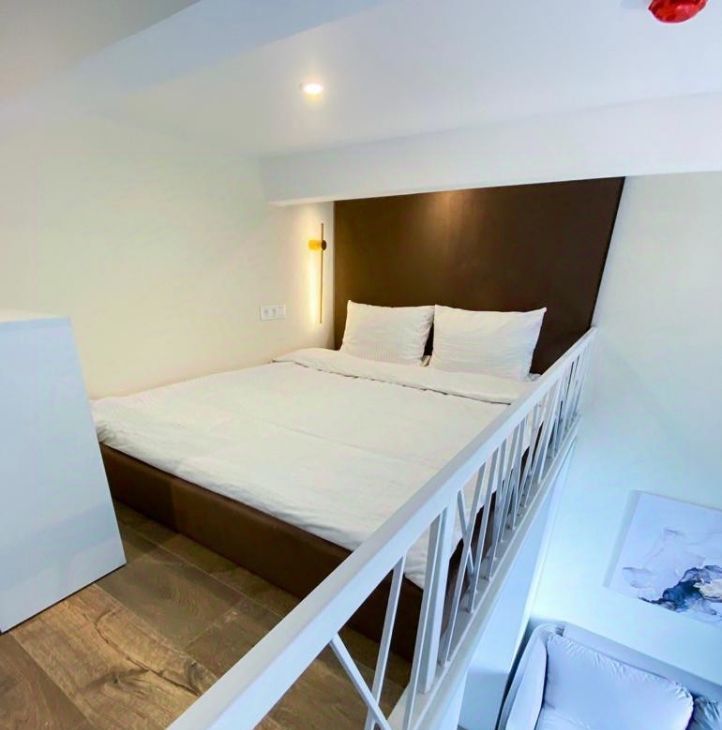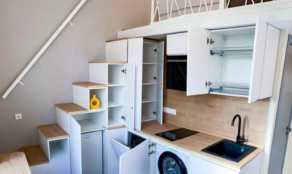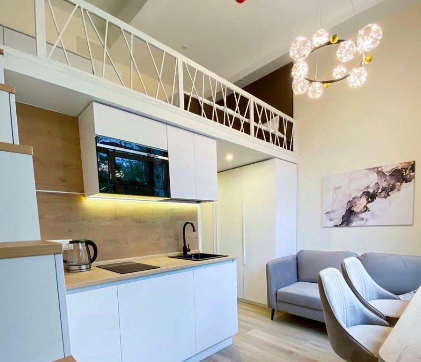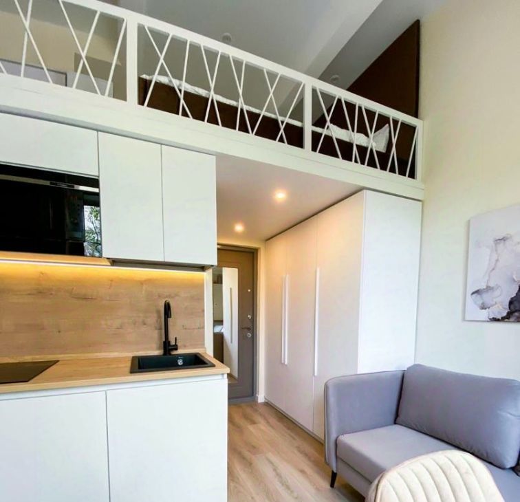 Очень уютная студия - диван, стулья и кровать из приятного качественного велюра, продумано освещение с переключением светильников, постельное белье, пол из прочного кварцвинила, кухня качественная с фасадами soft-touch, высота спальной зоны второго яруса 130-140 см.