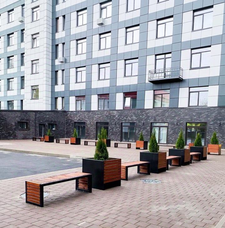Обустроенный закрытый внутренний двор с лавочками и зоной барбекю.