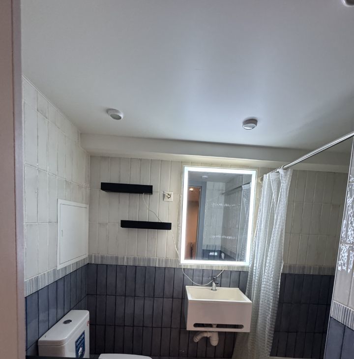 — вся сантехника новая: унитаз, раковина, душевой поддон, дизайнерские смесители