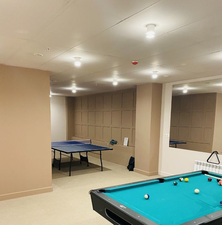 В комплексе для жителей : тренажерный зал, кардио зал, бильярдная, кинотеатр, комната для хранения велосипедов/самокатов, оборудованная терраса на крыше. Все это в свободном доступе для резидентов комплекса.