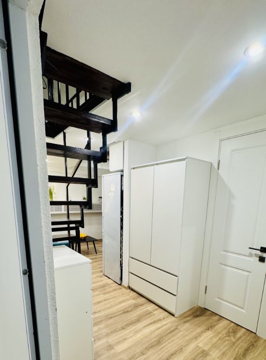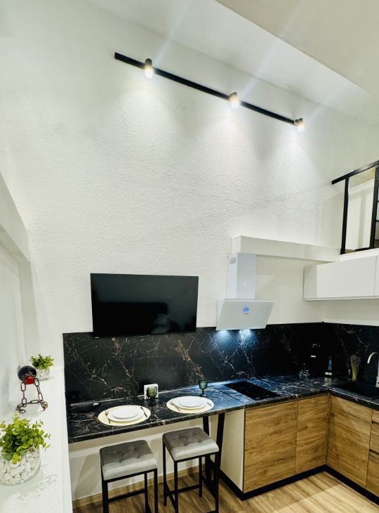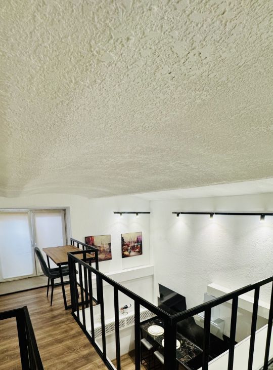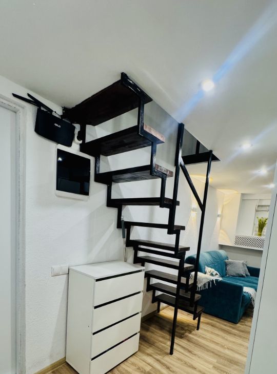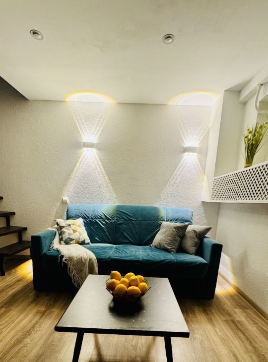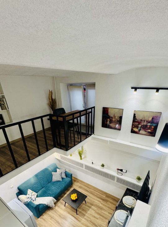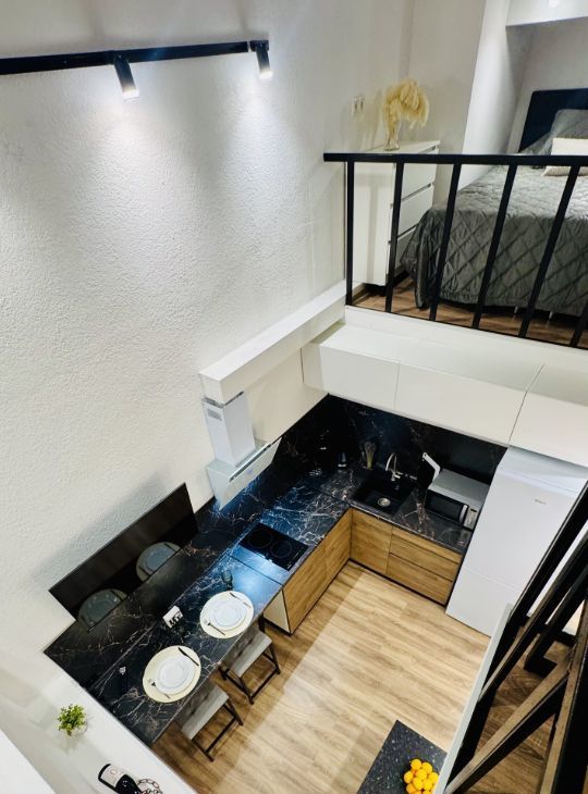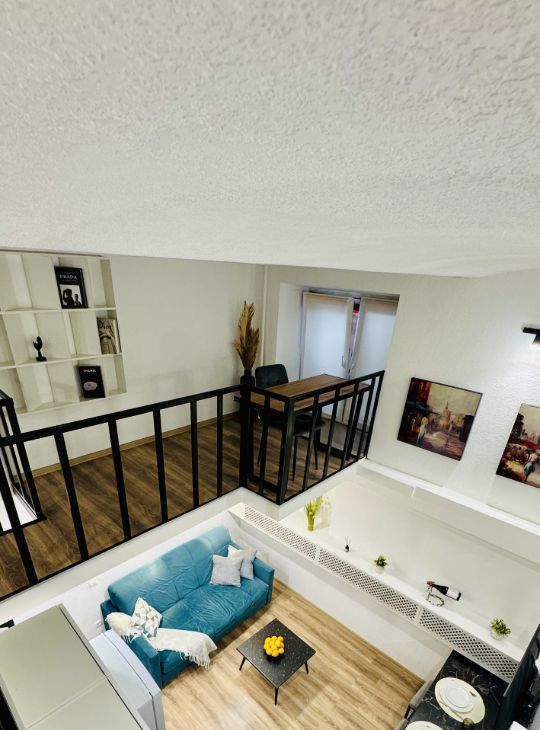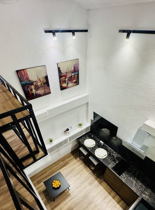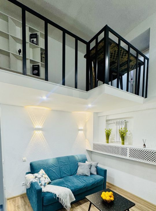 Апартаменты имеют высокие потолки, расположены на цокольном этаже многоквартирного дома. Пространство разделено на две функциональные уровни, что создает ощущение лофта и приватности одновременно. Никто не жил до вас — вы будете первыми!