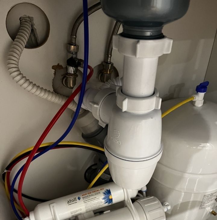 Кухня с полной встроенной техникой: холодильник, посудомоечная машина, микроволновка, варочная поверхность и система очистки воды.