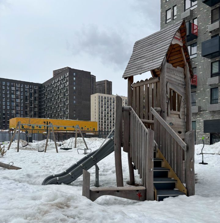 Приятный двор с детскими площадками и ландшафтным дизайном.