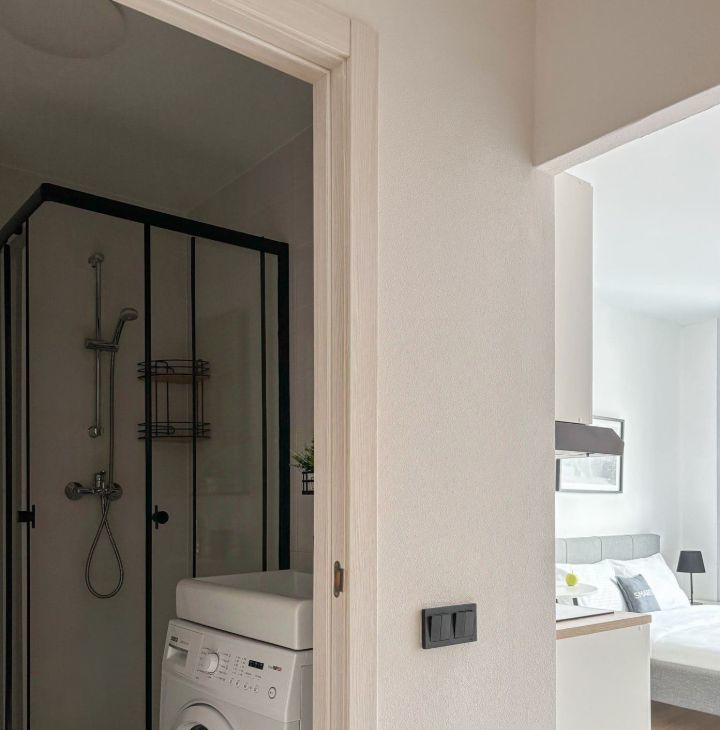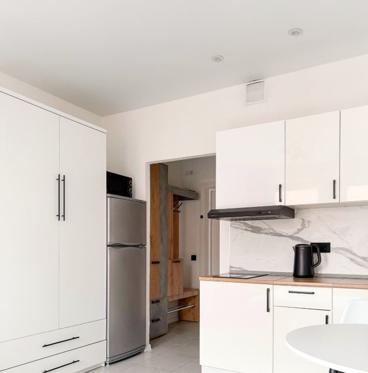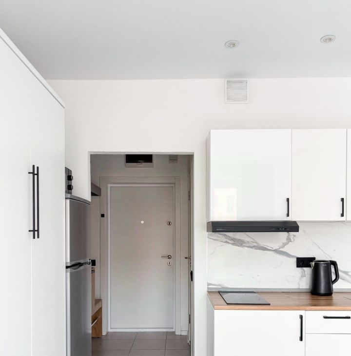 Бытовая техника: Холодильник, индукционная варочная панель, вытяжка, микроволновая печь, стиральная машина, утюг, чайник, телевизор.