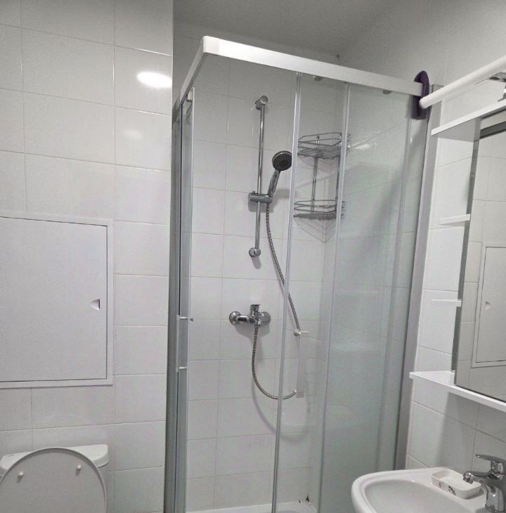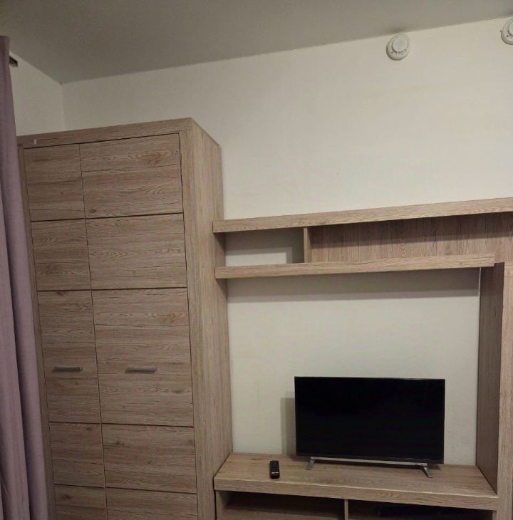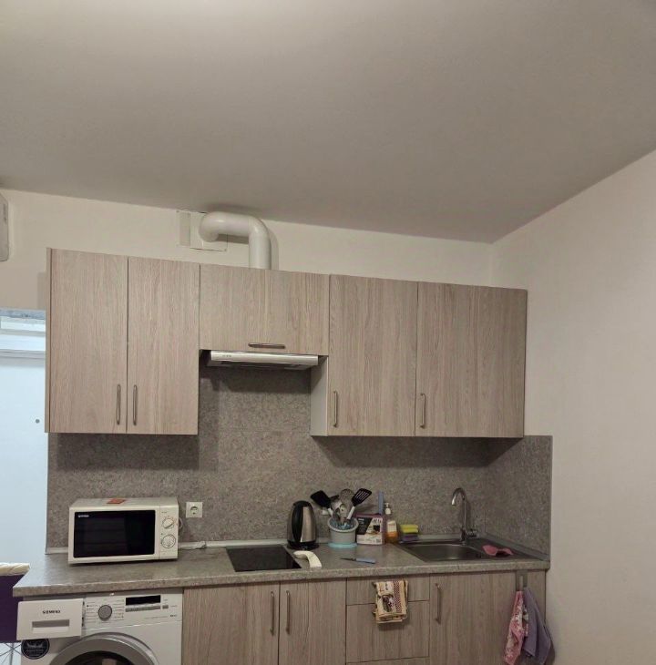 В студии есть вся необходимая мебель на кухне и в комнате. Установлена современная техника: кондиционер, холодильник, телевизор и стиральная машина. Ванная комната оборудована душевой кабиной, что особенно удобно для быстрого и комфортного начала дня.