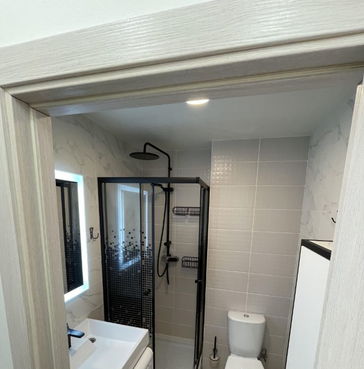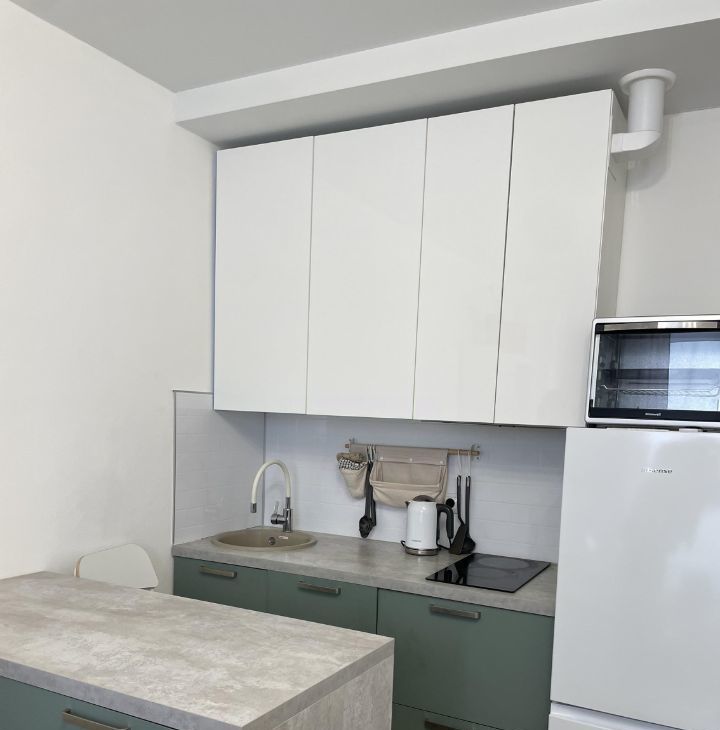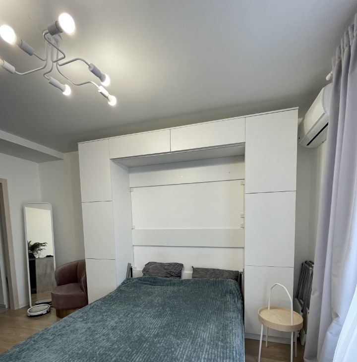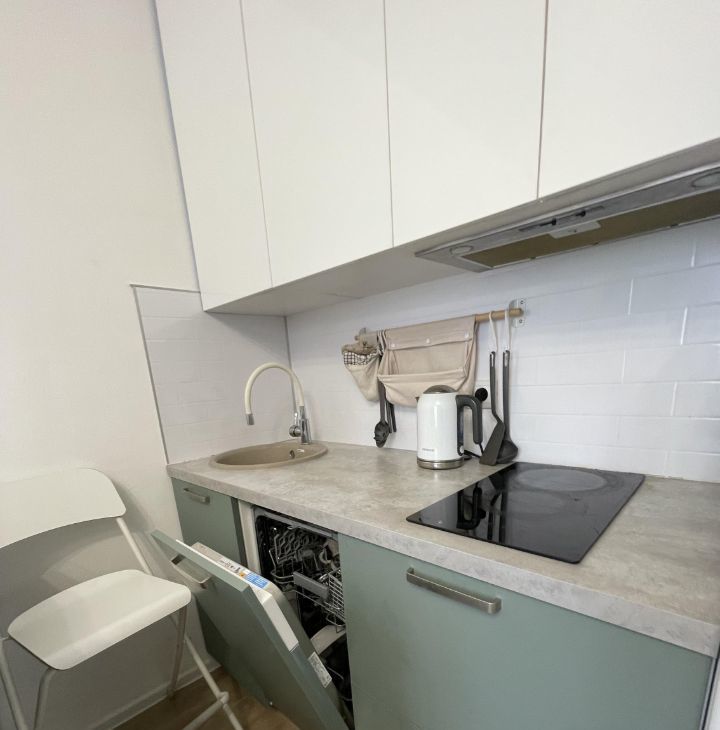 Светлая, современная студия со всем необходимым для проживания: кондиционер, холодильник, посудомоечная машина, стиральная машина.