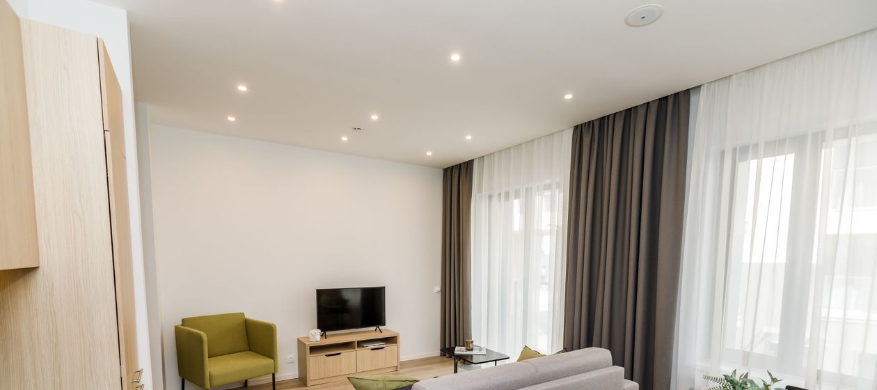 Сдатся просторная студия с современным ремонтом. Встроенный кухонный гарнитур, встроенный холодильник, вся необходимая бытовая техника, включая посудомоечную машину. Полностью мебелирован мягкой и корпусной мебелью. Шторы. Один санузел. Стиральная машина в ванной комнате. Санузел отделан плиткой. Высокие потолки (3 метра).