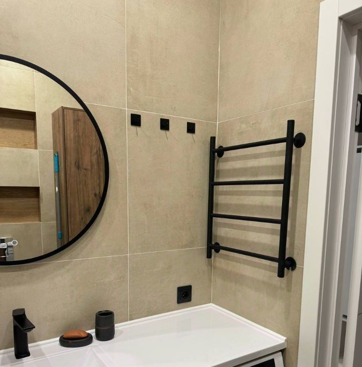 В ванной стиральная машина, электрический полотенцесушитель, ванна.