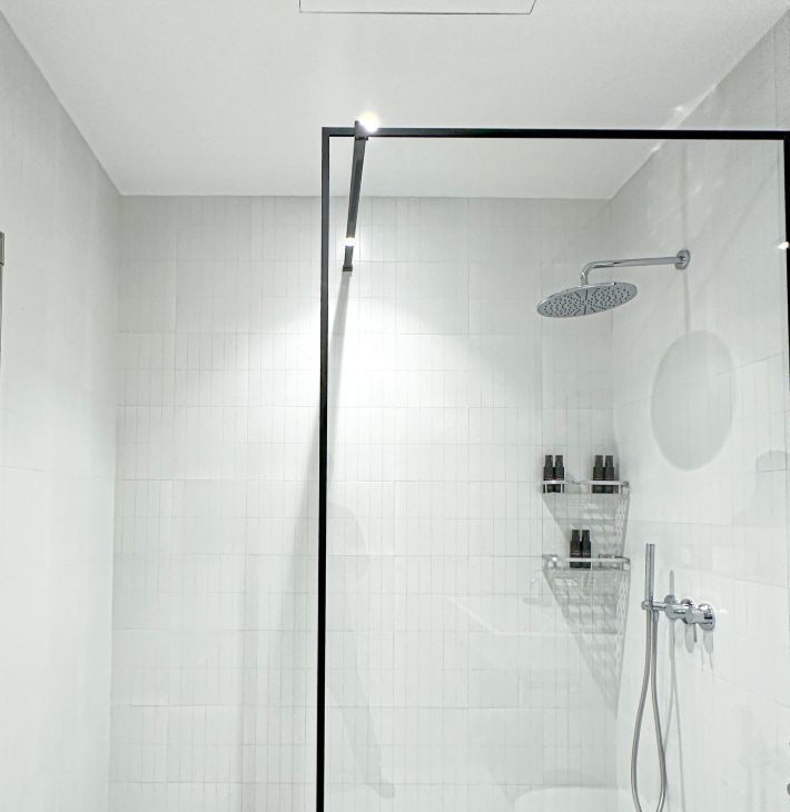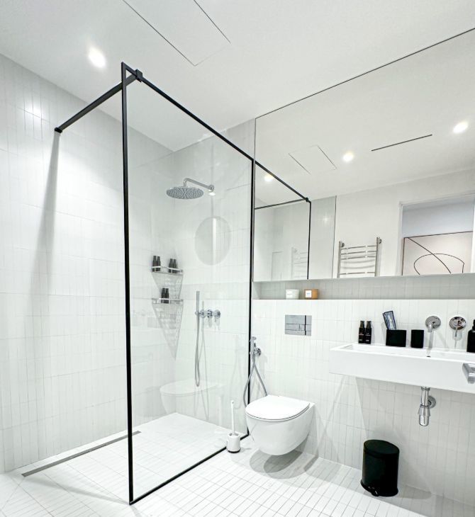 В Санузле просторная душевая кабина, большое зеркало над раковиной, полотенцесущитель и теплый пол.