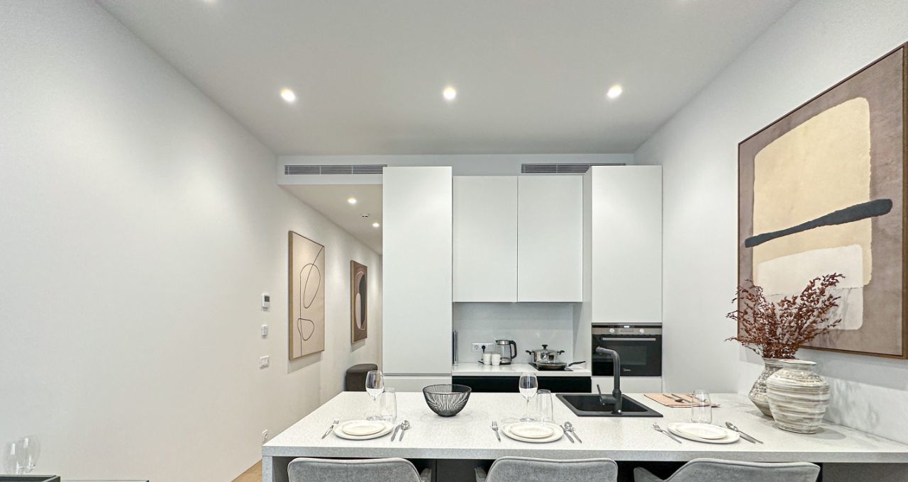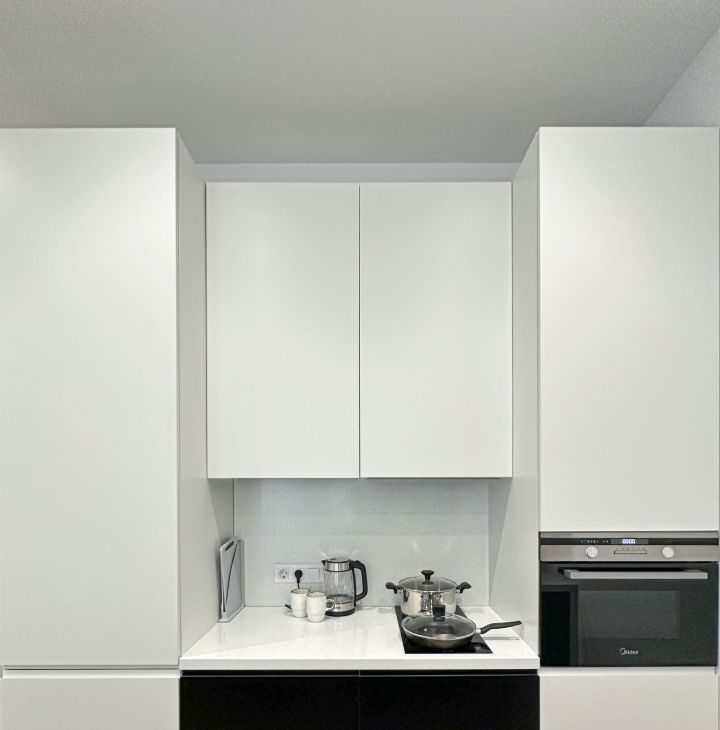 Кухня оснащена варочной панелью, посудомоечной машиной, СВЧ, духовым шкафом, сушкой для посуды, вытяжкой, двухкамерным холодильником и тремя барными стульями.