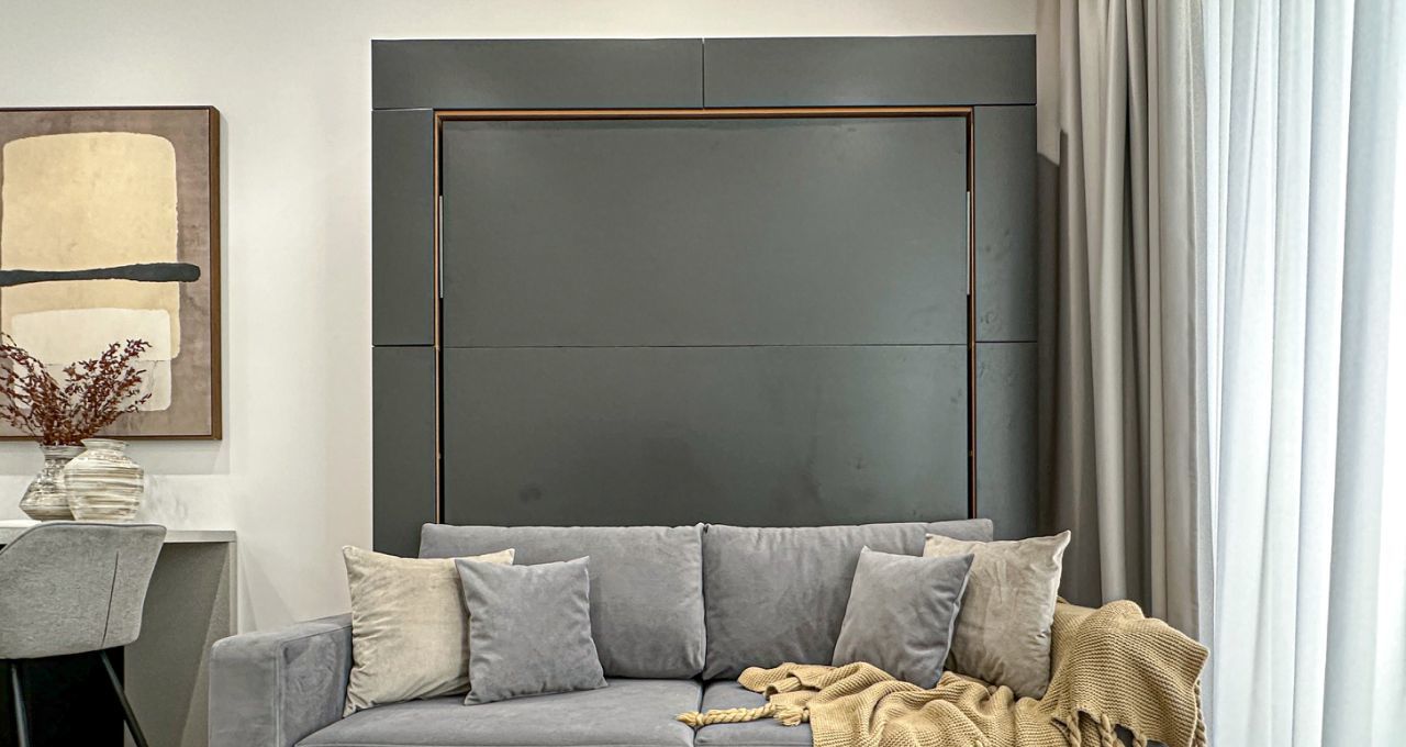 Гостиная оснащена двуспальным кроватью-трансформером, стильным журнальным столиком, пуфиком и мультимедиа .