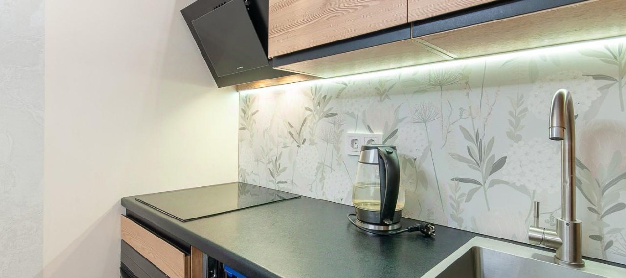 В квартире есть всё необходимое для комфортного проживания: дизайнерский ремонт, мебель на кухне и в комнате, а также необходимая техника — кондиционер, холодильник, посудомоечная и стиральная машины, телевизор. Санузел совмещённый, оборудован душевой кабиной. Окна выходят на улицу, что обеспечивает хорошую освещённость.