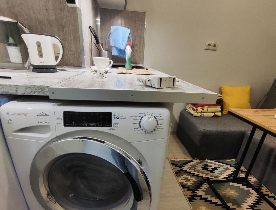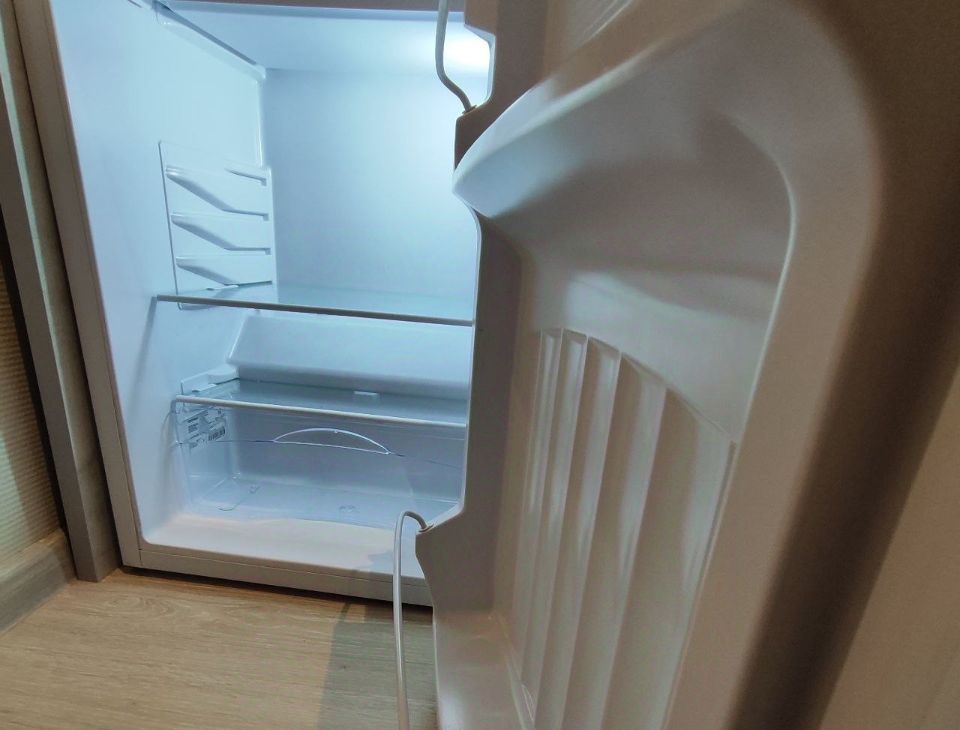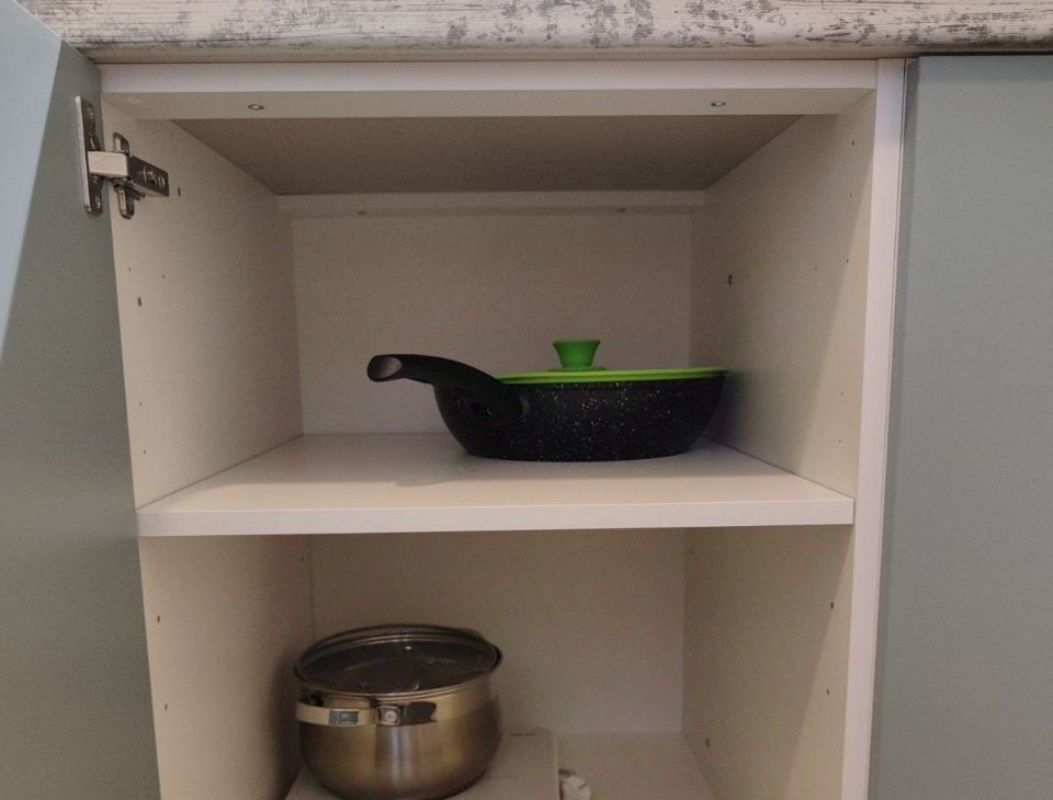 Кухонная зона: вытяжка, раковина, 1-конфорочная эл.плитка, чайник, СВЧ, холодильник, минимальный набор посуды