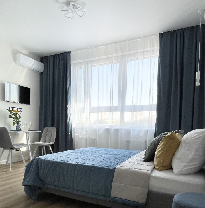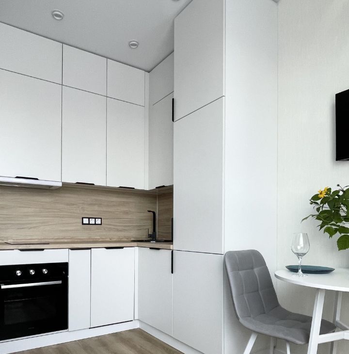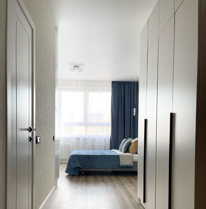 Функциональная планировка: зона сна и отдыха с широкой кроватью и ортопедическим матрасом, кухня с максимальным наполнением, зона приема пищи, просторный санузел с душевой, входная группа с большим шкафом.