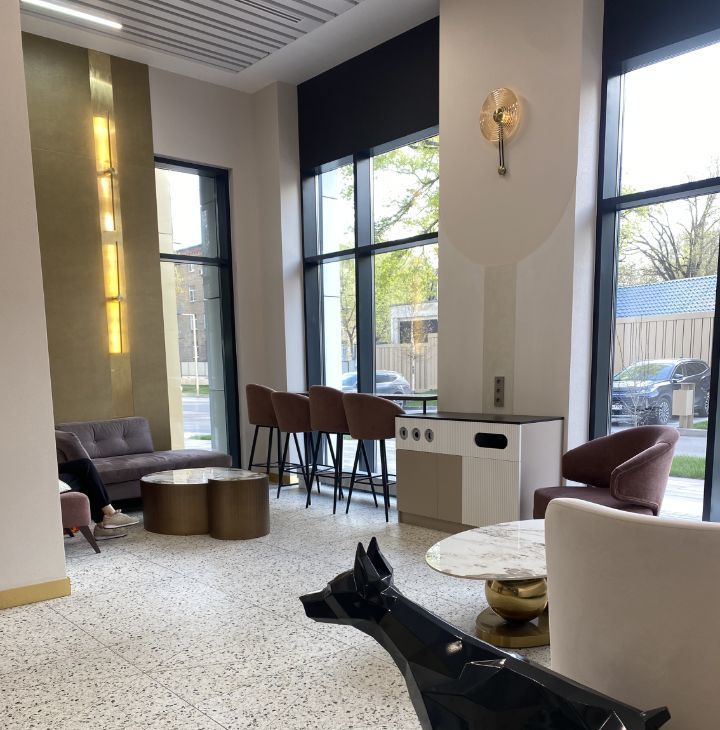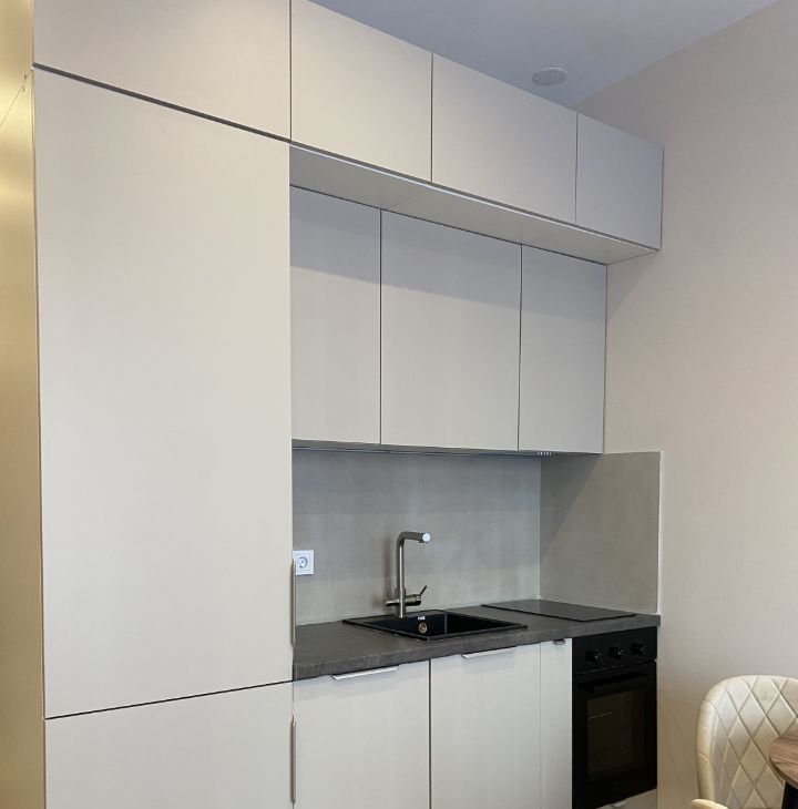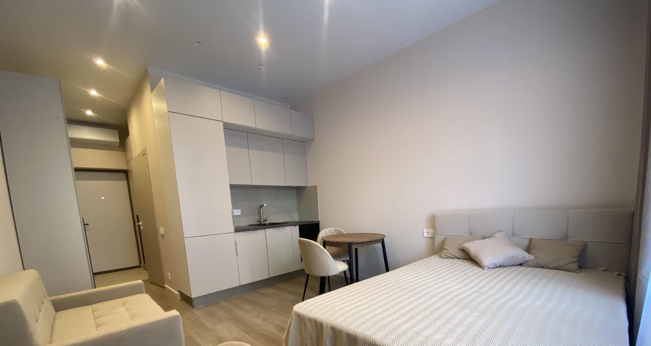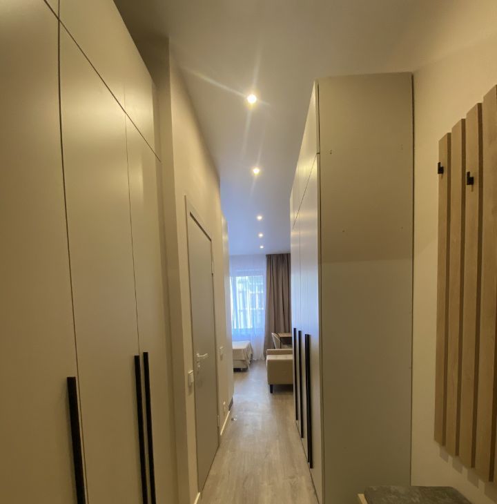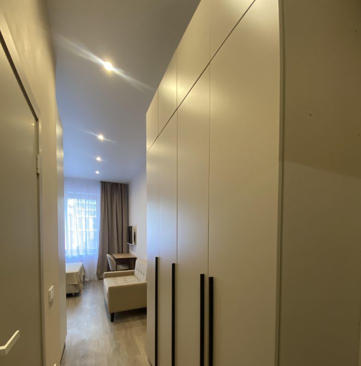 Общая площадь 25 кв.м. Потолки 3 метра. Сделан качественный Евроремонт, все со вкусом для комфортного проживания. Вся необходимая техника, включая посудомоечную машину. Вид во двор. Просторные входные группы с высокими потолками и респектабельной эстетикой. Разнообразными зонами отдыха.