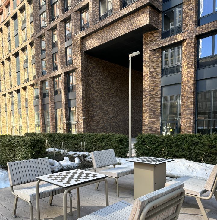 На собственной закрытой территории расположены зеленые зоны с цветниками, места для отдыха, спортивные и игровые площадки.