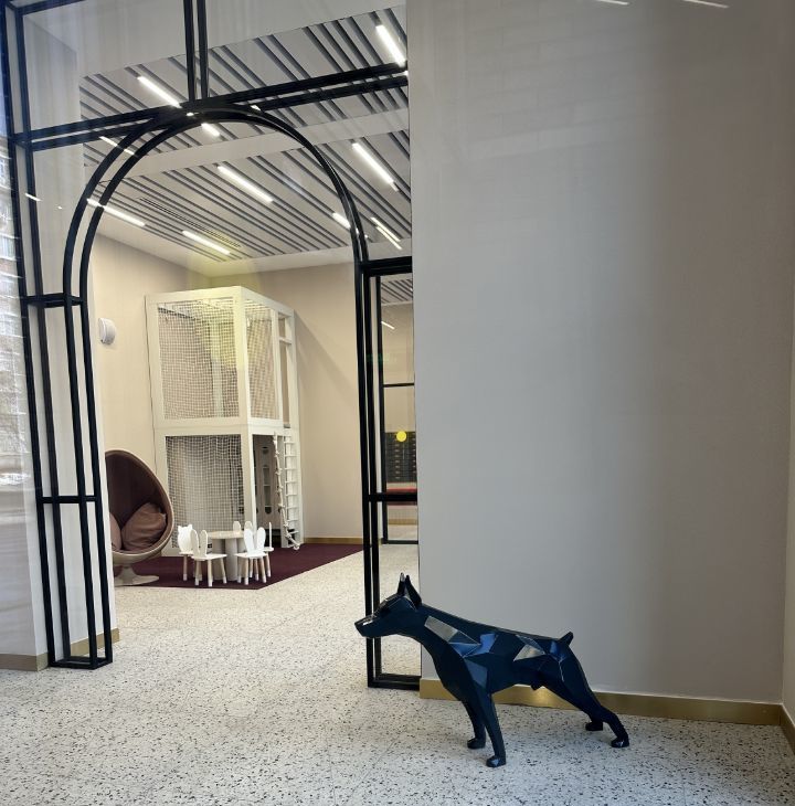 Ресепшен, туалет, колясочные и мойки для лап животных и колясок.