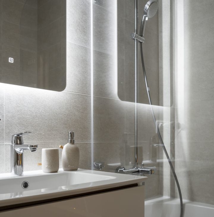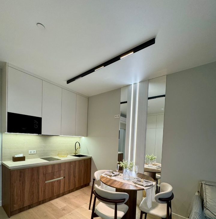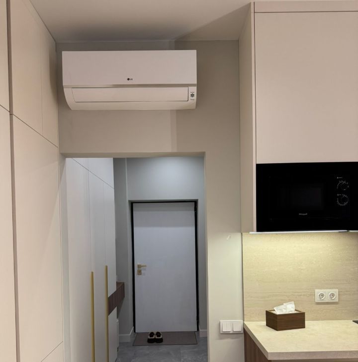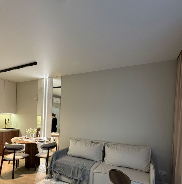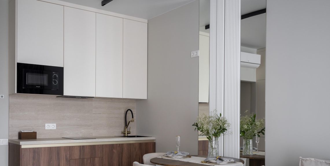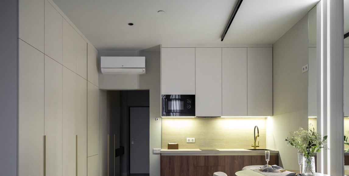 Функциональная планировка: кухня-гостиная с зоной спальни, ванная комната, гардеробная и прихожая.
