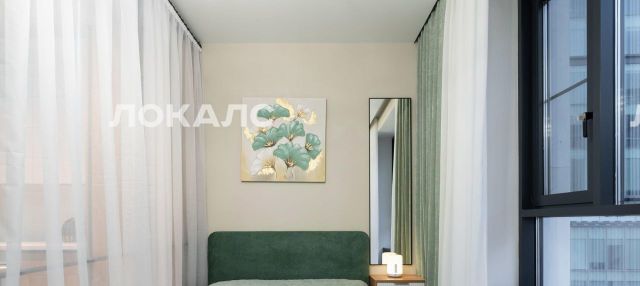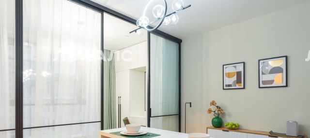 Предлагается к аренде стильная студия премиум-класса с дизайнерским ремонтом, выполненная в светлых, гармоничных тонах с акцентами зеленого. Пространство в студии разграничено уютной раздвижной перегородкой, которая отделяет зону спальни, рабочую зону и кухню, создавая ощущение двух комнат в компактном формате, где удобно и отдыхать, и работать.