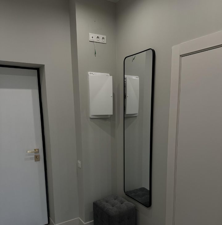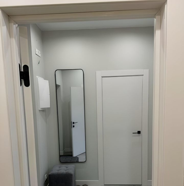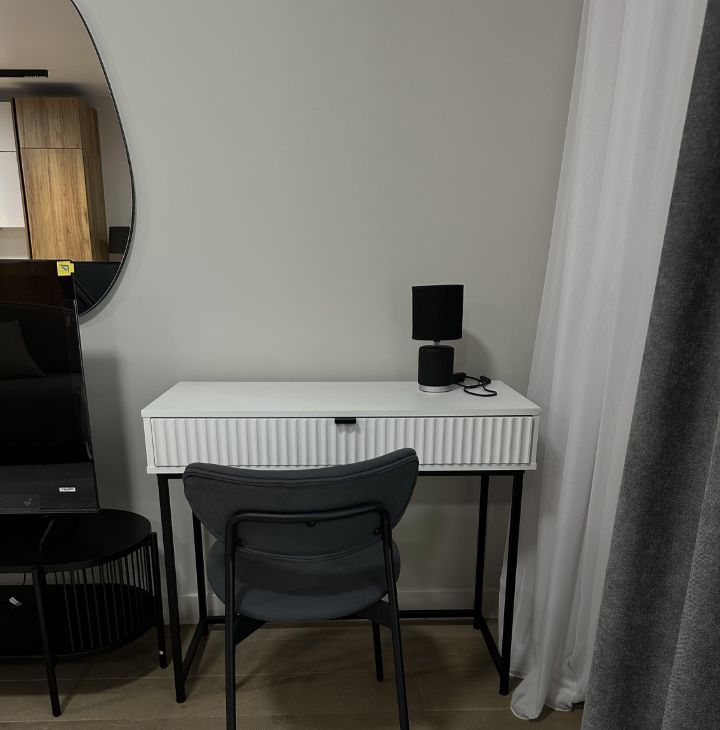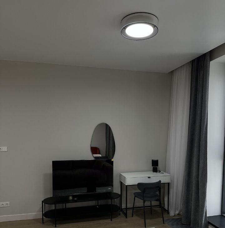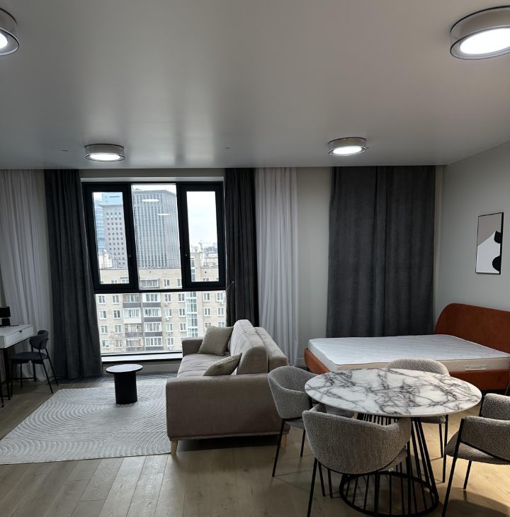 В квартире выполнен дизайнерский ремонт в современном стиле: сдержанная цветовая гамма, качественные отделочные материалы, стильные акценты в интерьере. Пространство грамотно зонировано — несмотря на формат студии, здесь комфортно и жить, и работать. Оборудована рабочая зона с современным столом и стулом, два комфортных спальных места, а также отдельная гардеробная, где удобно хранить вещи и поддерживать порядок. Совмещённый санузел с качественной сантехникой.