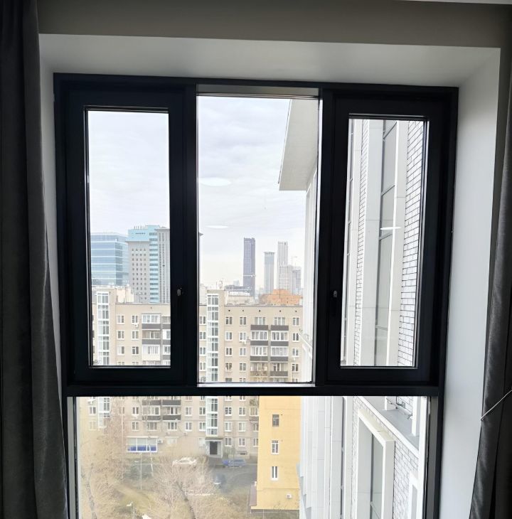 Главное украшение студии — панорамные окна от пола до потолка. Они наполняют квартиру естественным светом в течение всего дня и открывают впечатляющий вид на город. Утренний кофе с таким видом задаёт настроение на весь день.