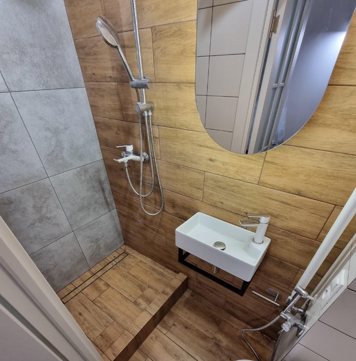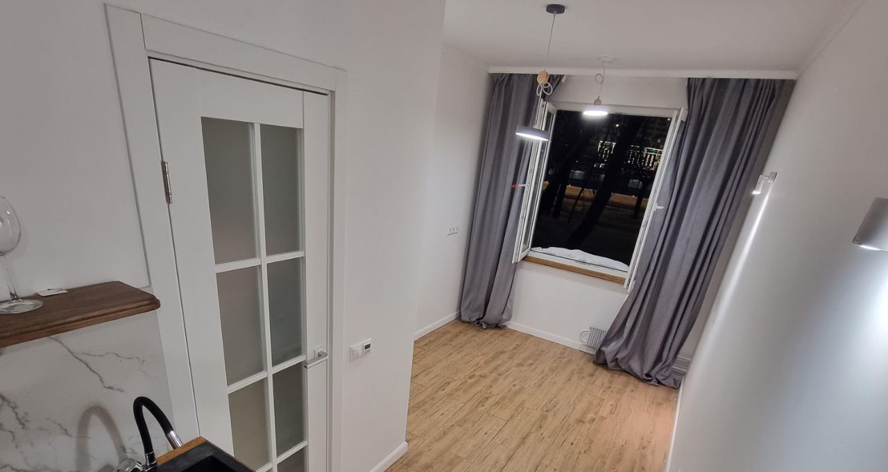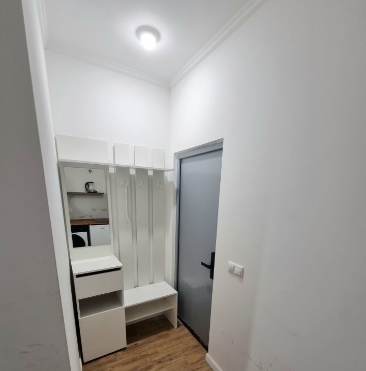 В студии сделан качественный евроремонт, который создает атмосферу комфорта и уюта. Установленный теплые полы для комфортного проживания в холодные сезоны. Из техники есть холодильник и стиральная машина с функцией сушки белья. Ванная комната оборудована душем.