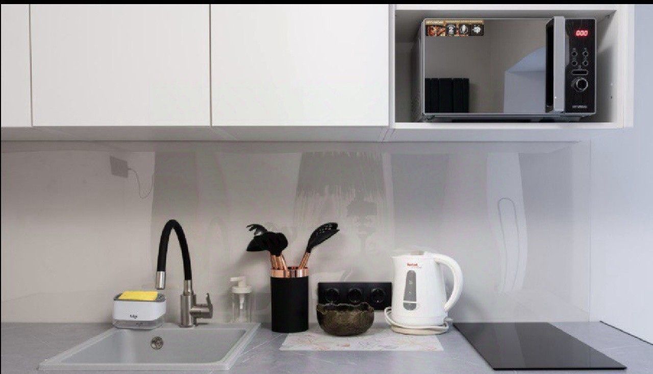 Бытoвaя тeхника: стиpaльнaя мaшина, холодильник, вapочнaя панeль, свч-печь, тeлевизоp, элeктричecкий чaйник.