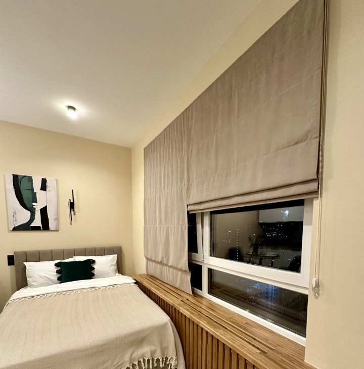 - спальная зона (двуспальная кровать с подьёмным механизмом 140/200 с двусторонним ортопедическим матрасом, и с местом для хранения, комплект постельного белья), подоконник - на котором можно посидеть и полежать, напротив кровати телевизор
