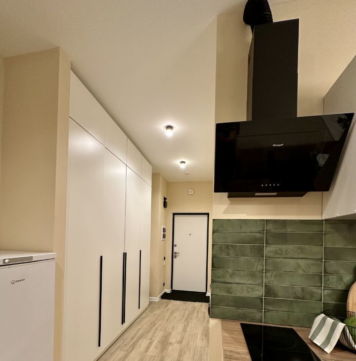 - кухня и обеденная зона (индукционная плита, посудомоечная машина, микроволновая печь с грилем, аэрогриль, холодильник, чайник, набор посуды для приготовления и употребления пищи, вытяжка (что немаловажно в студиях)