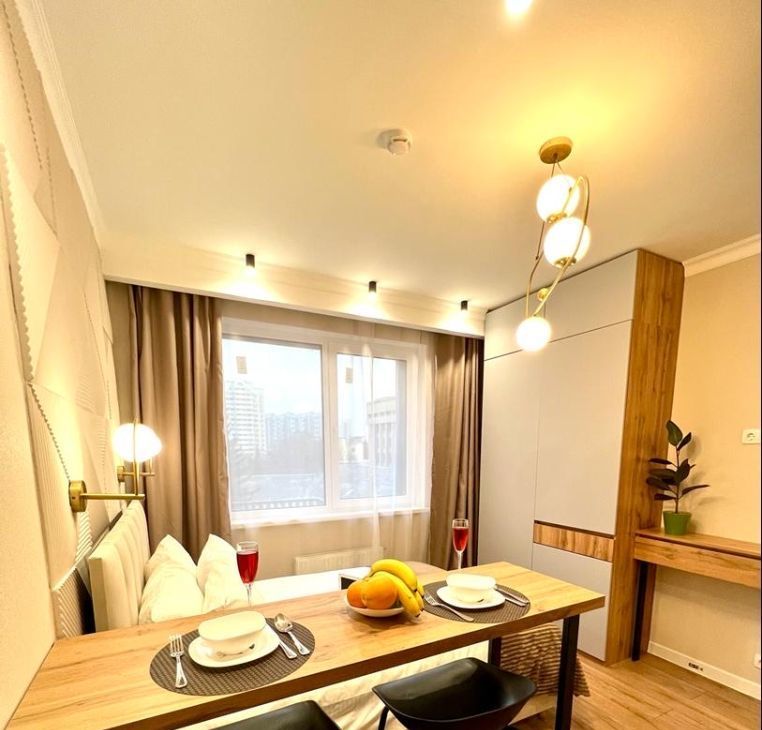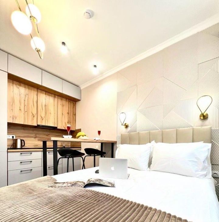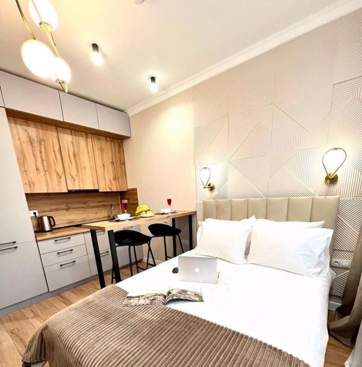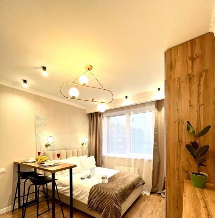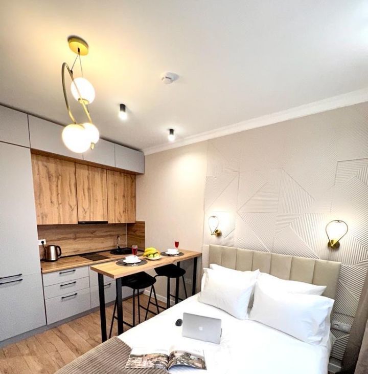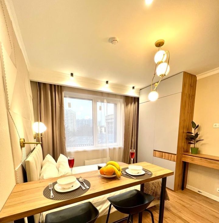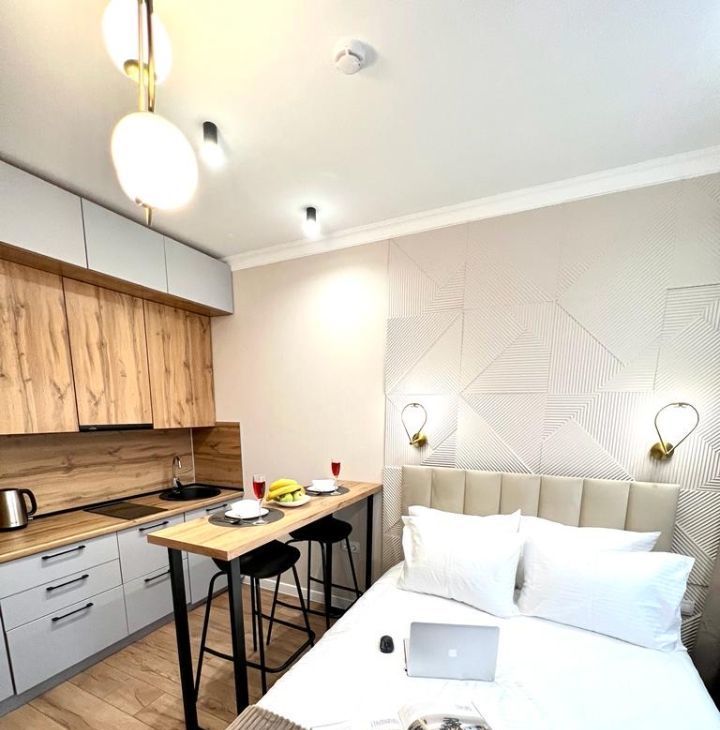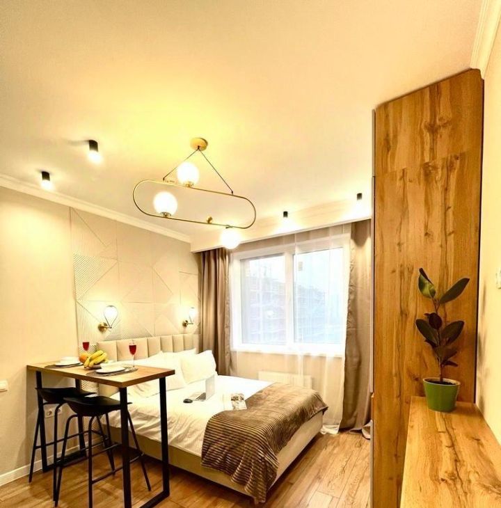 Сдается стильная студия с дизайнерским ремонтом в монолитном доме. Просторная жилая зона включает в себя уютную спальню с двуспальной кроватью и встроенными шкафами, а также функциональную кухню с современной техникой, включая холодильник и микроволновую печь. В квартире есть стиральная машина и совмещенный санузел с ванной.