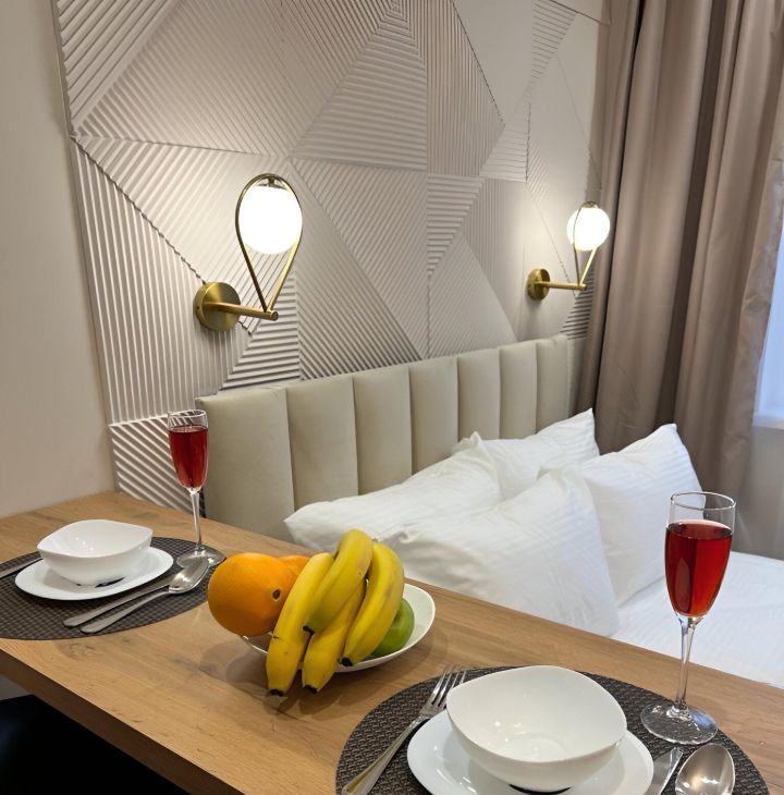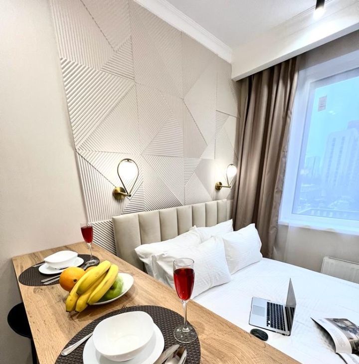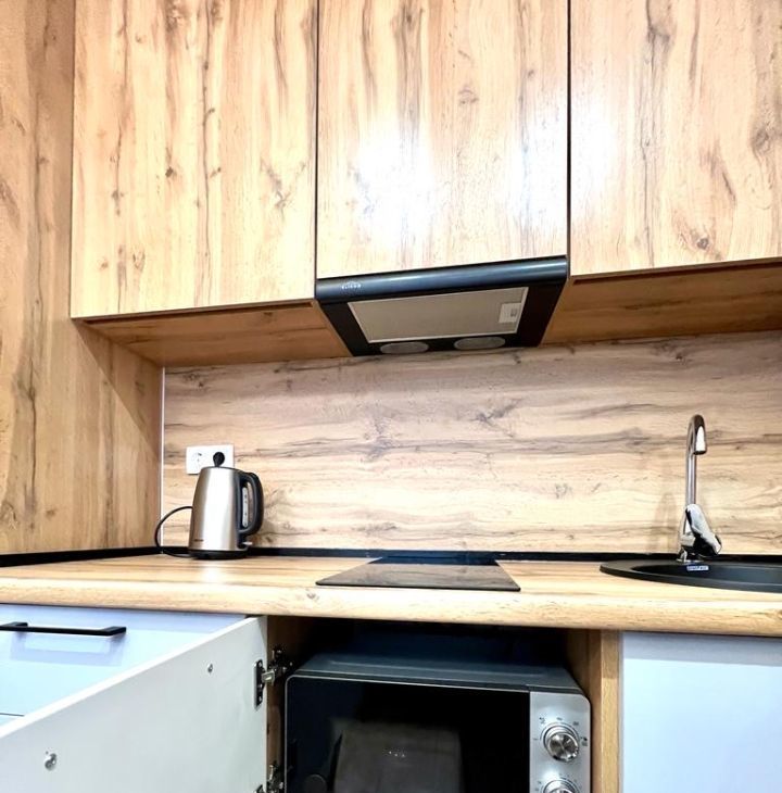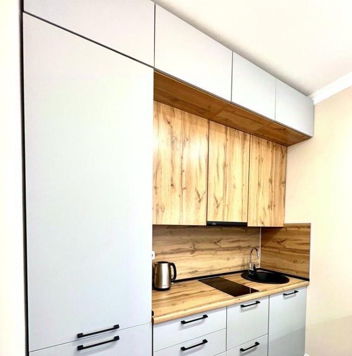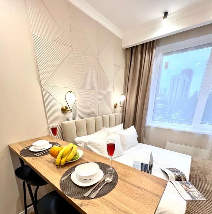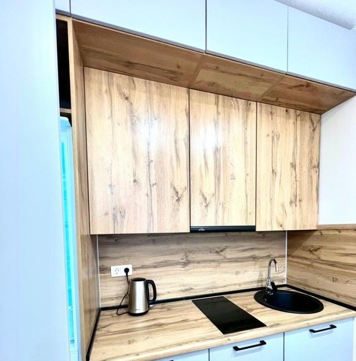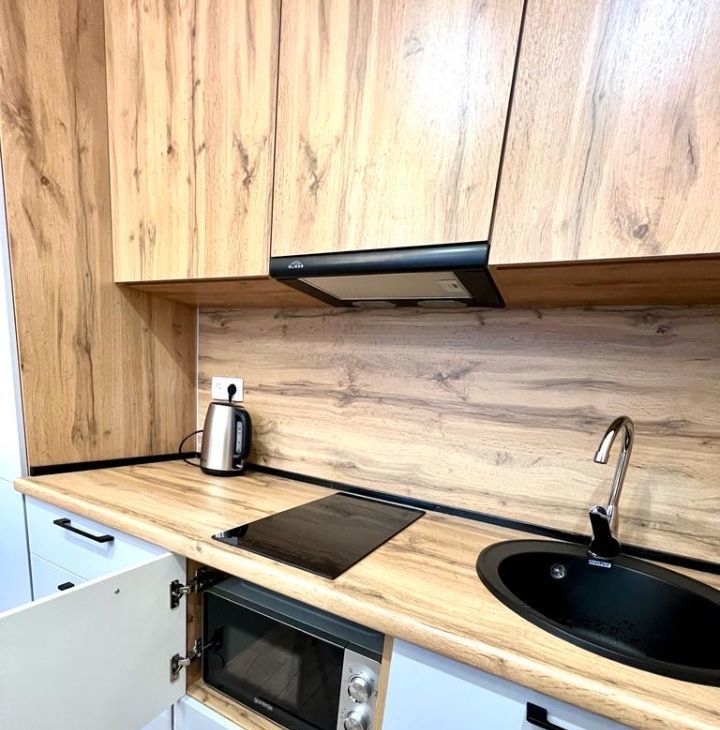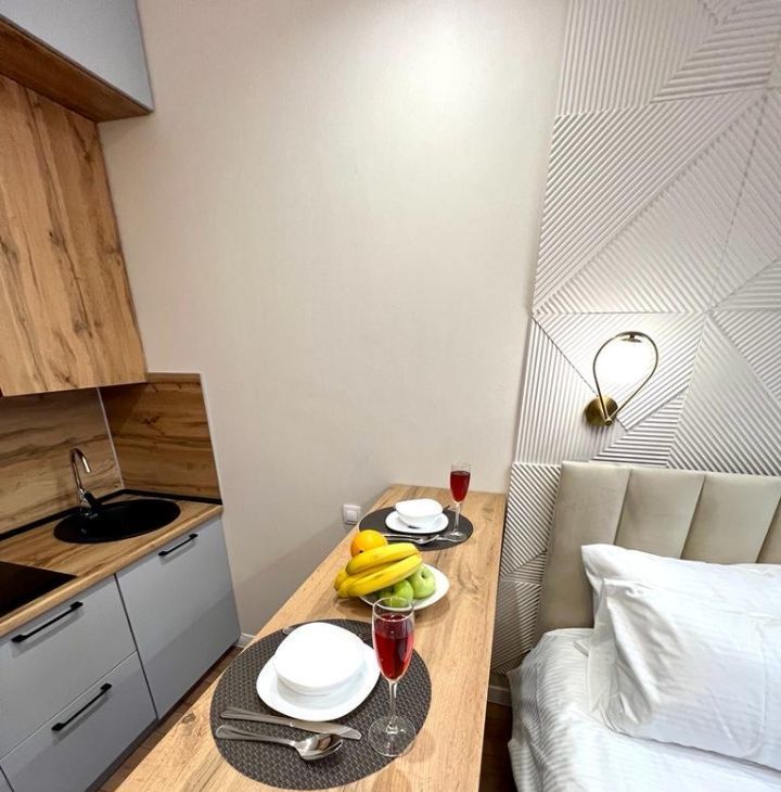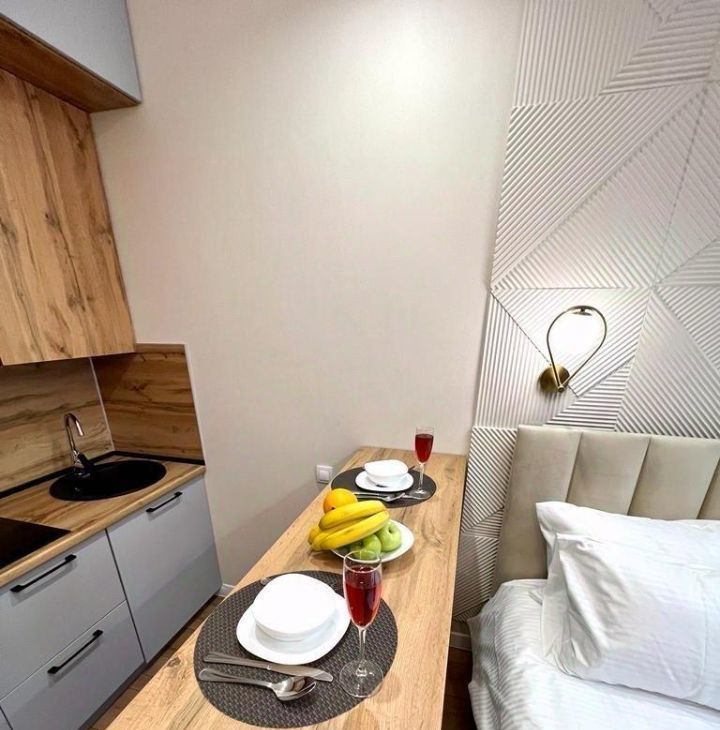 Сдается стильная студия с дизайнерским ремонтом в монолитном доме. Просторная жилая зона включает в себя уютную спальню с двуспальной кроватью и встроенными шкафами, а также функциональную кухню с современной техникой, включая холодильник и микроволновую печь. В квартире есть стиральная машина и совмещенный санузел с ванной.