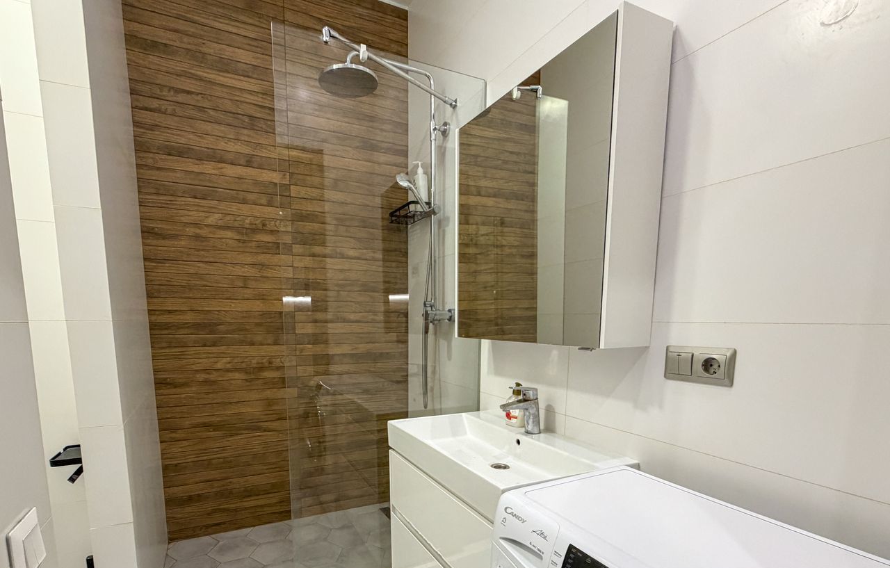 — Стиральная машина, бойлер, санузел с душевой кабиной.