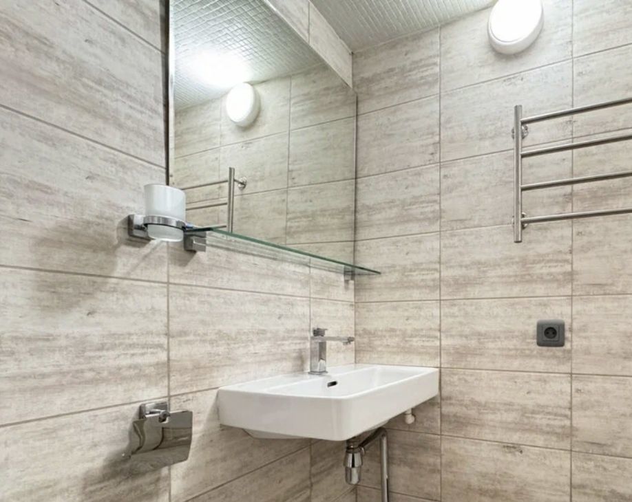 В квартире выполнен дизайнерский ремонт с современными решениями. Обстановка включает мебель как в комнате, так и на кухне. Из техники есть все необходимое для комфортного проживания: кондиционер, холодильник, телевизор и стиральная машина. Санузел совмещенный и оборудован душевой кабиной.