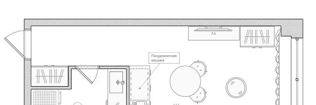 - зона для сна и отдыха (раскладной диван с журнальным столиком, телевизор, шкафы и тумбы для хранения, шторы блэкаут)