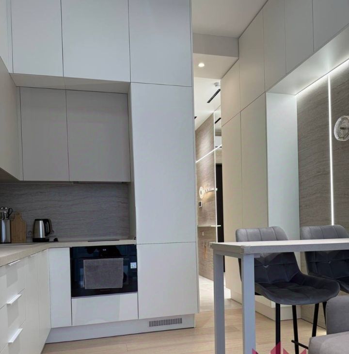Студия площадью 24 кв. м выполнена с дизайнерским ремонтом премиум-качества. Вас ждет продуманная планировка с выделенной зоной кухни-гостиной и спальным местом, высокие потолки 3.5 метра и окна с видом на улицу, наполняющие пространство светом. Вся необходимая техника уже установлена: кондиционер, стиральная и посудомоечная машины, холодильник, телевизор. Кухня оборудована мебелью, есть высокоскоростной интернет. Мебель подобрана со вкусом, что позволяет заселиться с одним чемоданом.