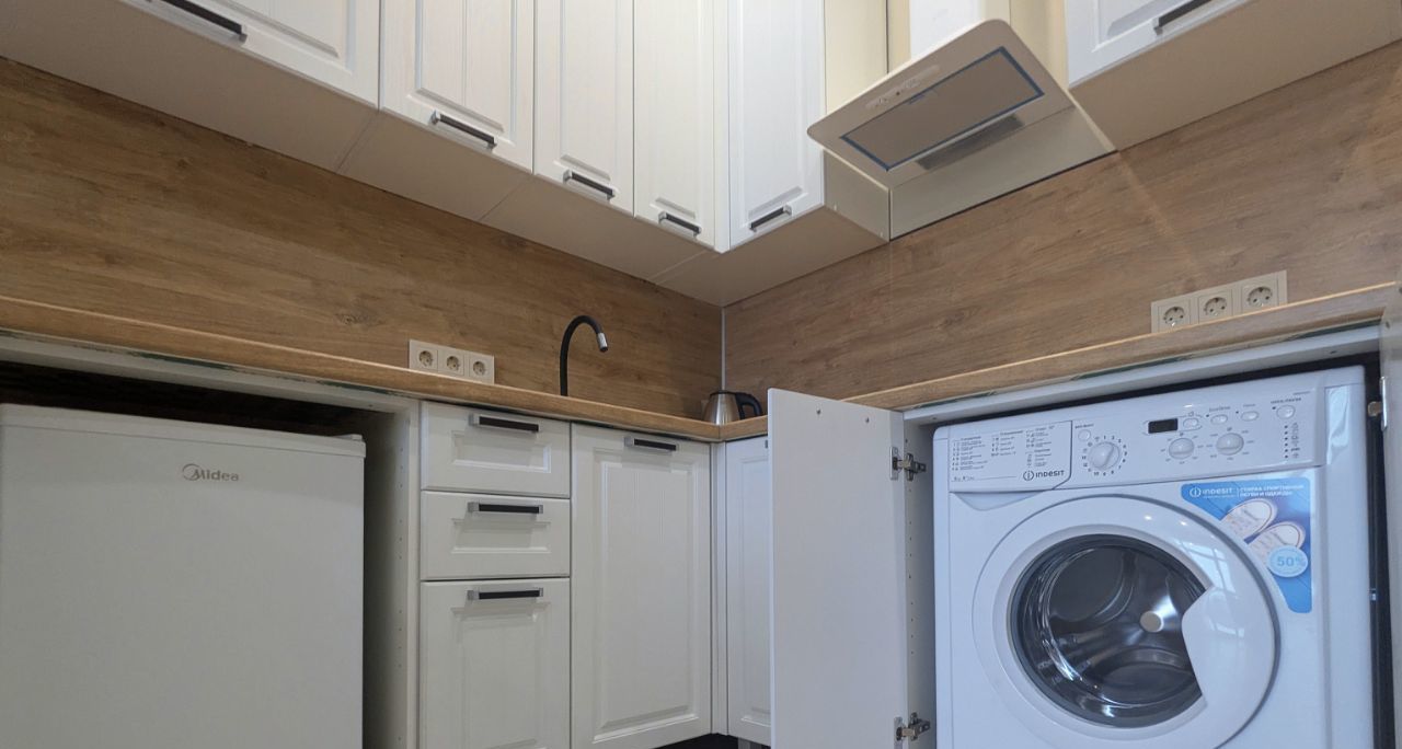 ---Раздвижной диван, кухонная стенка, стиральная машина, чайник, холодильник, посуда, есть балкон.