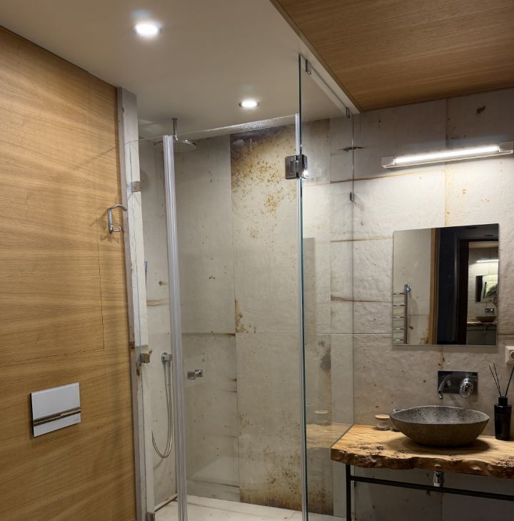 В квартире совмещенный санузел с душем, раковиной, биде, шкафом и зеркалом с подсветкой.