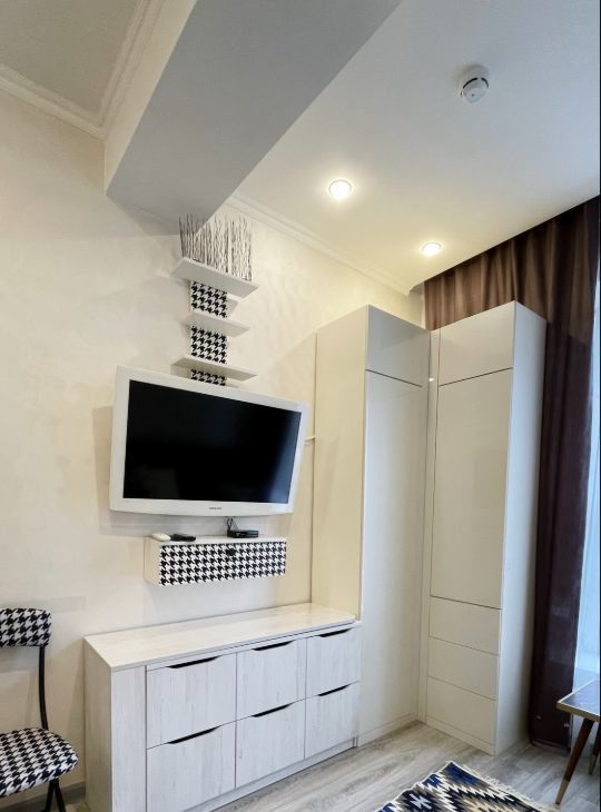Студия укомплектована всем необходимым для комфортного проживания, включая посуду, технику, прочие бытовые мелочи и модный декор. Есть все - заезжай и живи!
