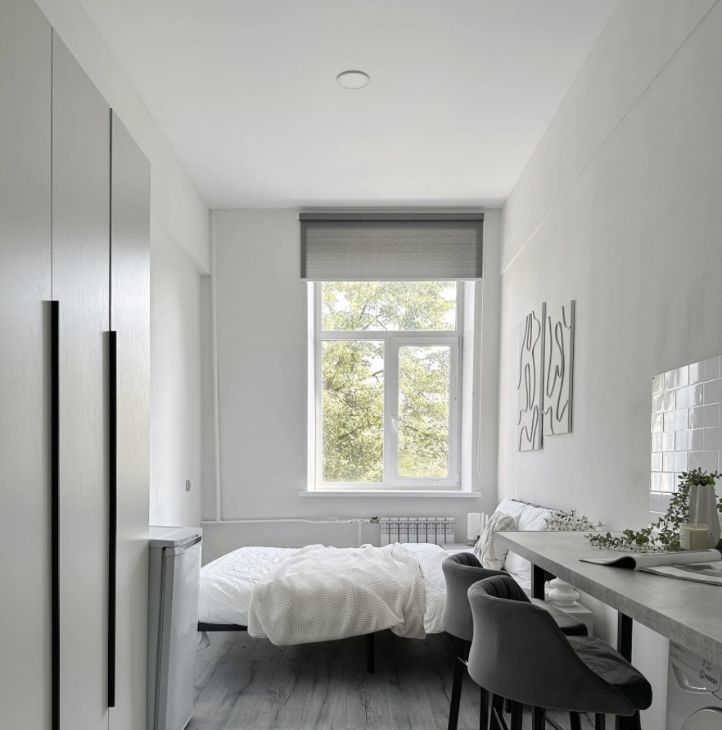 Светлые пастельные оттенки визуально увеличивают пространство, а минималистичный интерьер позволяет добавить детали на свой вкус.