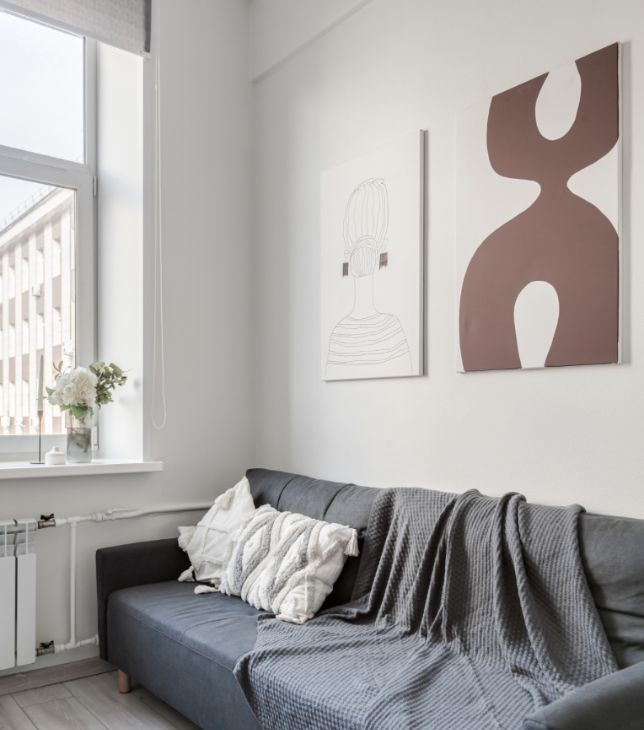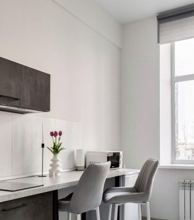 Светлые пастельные оттенки визуально увеличивают пространство, а минималистичный интерьер позволяет добавить детали на свой вкус.