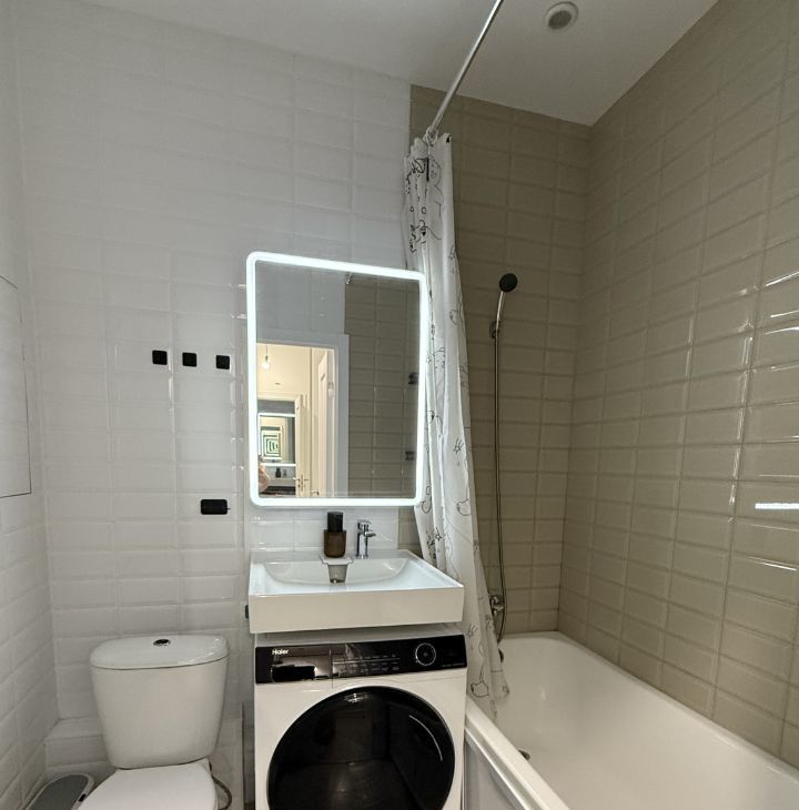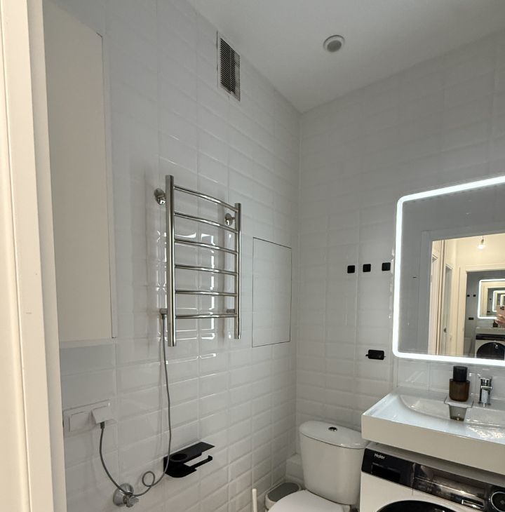 В ванной: стирально-сушильная машина (вам не нужно развешивать белье, что очень удобно в студии), два шкафчика, один с подсветкой, электрический полотенцесушитель.