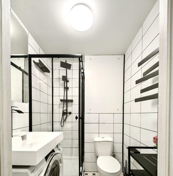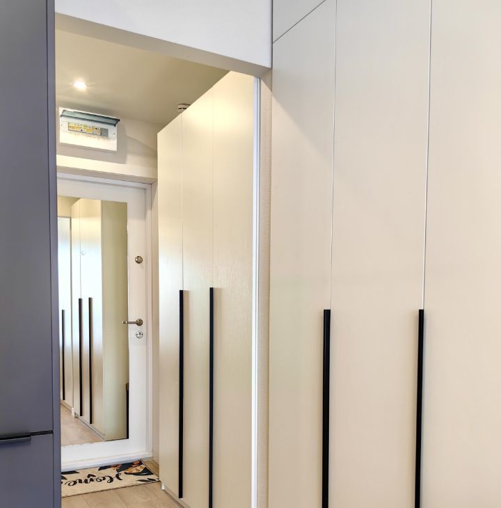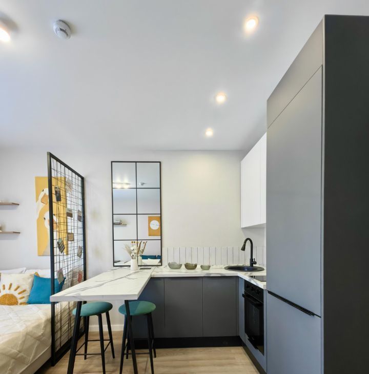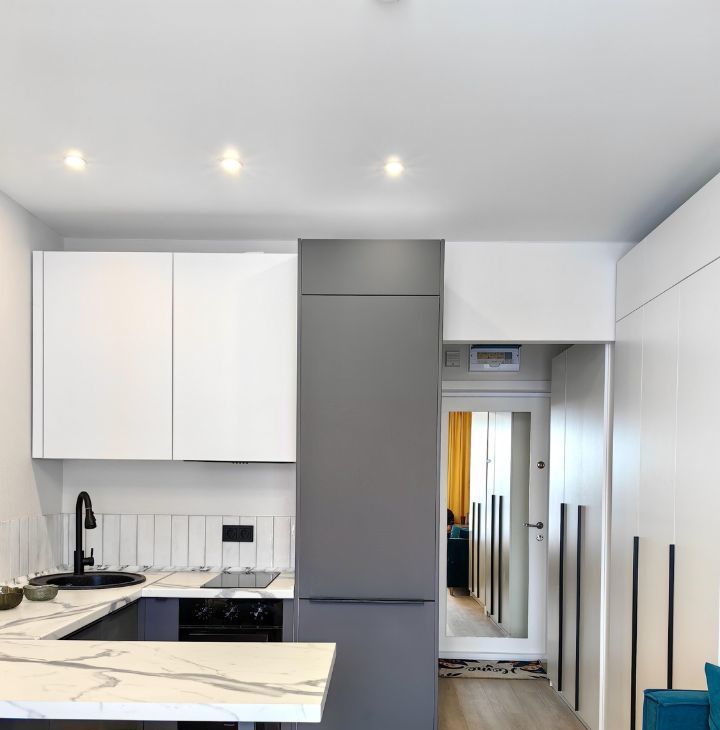 Полностью мебелирована и оборудована необходимой новой и современной техникой (посудомоечная посуда, встроенный и тихий холодильник с инверторным двигателем, стиральная машина с сушкой). Максимально возможное количество мест для хранения. Кровать на 140 см с подъемным механизмом и раскладывающийся диван.