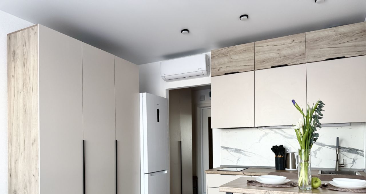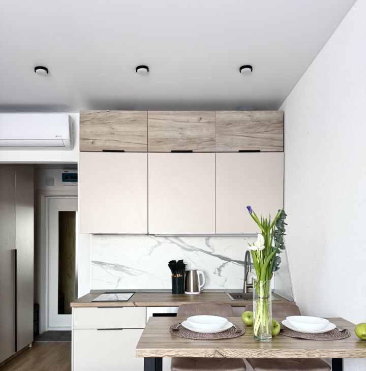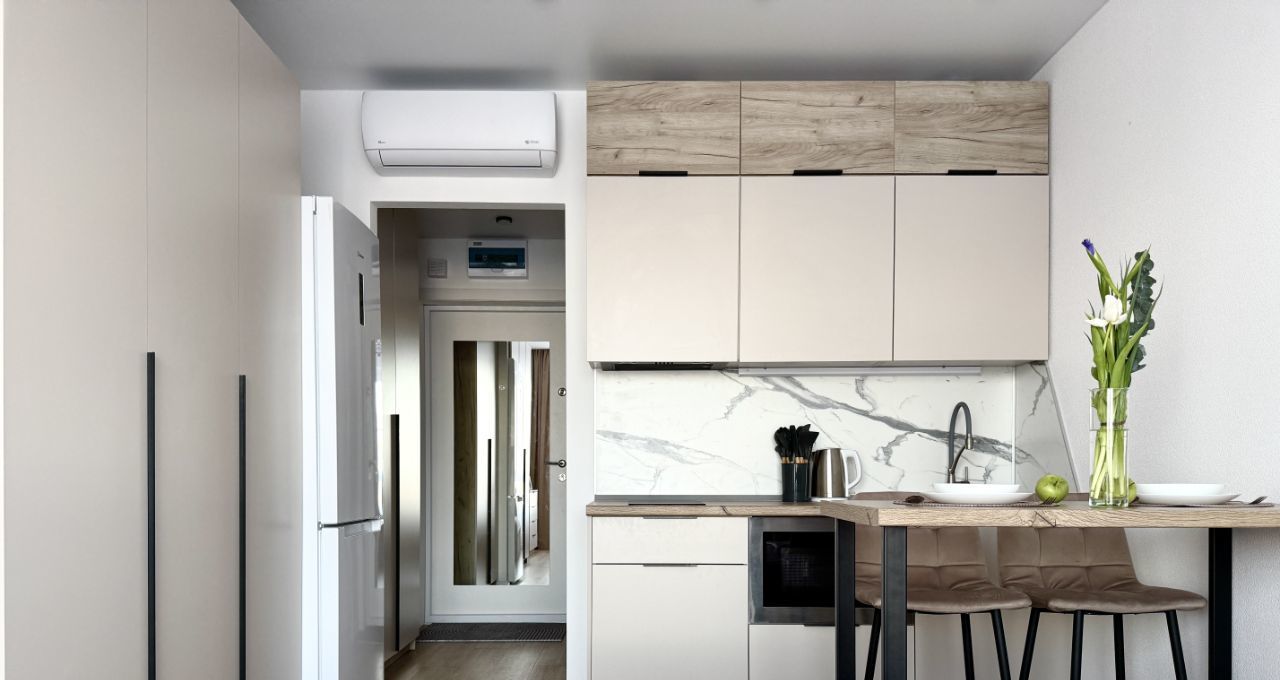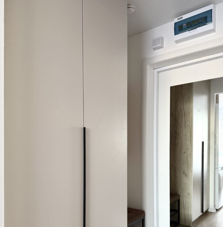 Бытовая техника: стиральная машина, холодильник, духовой шкаф, варочная панель, вытяжка, микроволновая печь, электрический чайник, пылесос, кондиционер, а так же все необходимое для комфортного проживания.