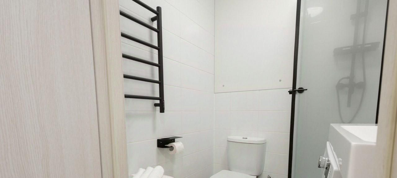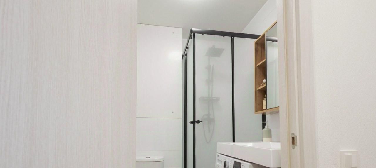 Ванная комната совмещенная, оснащена душевой кабиной и стиральной машиной. В прихожей установлен удобный шкаф для хранения вещей. В квартире есть кондиционер для комфортного проживания в любое время года.