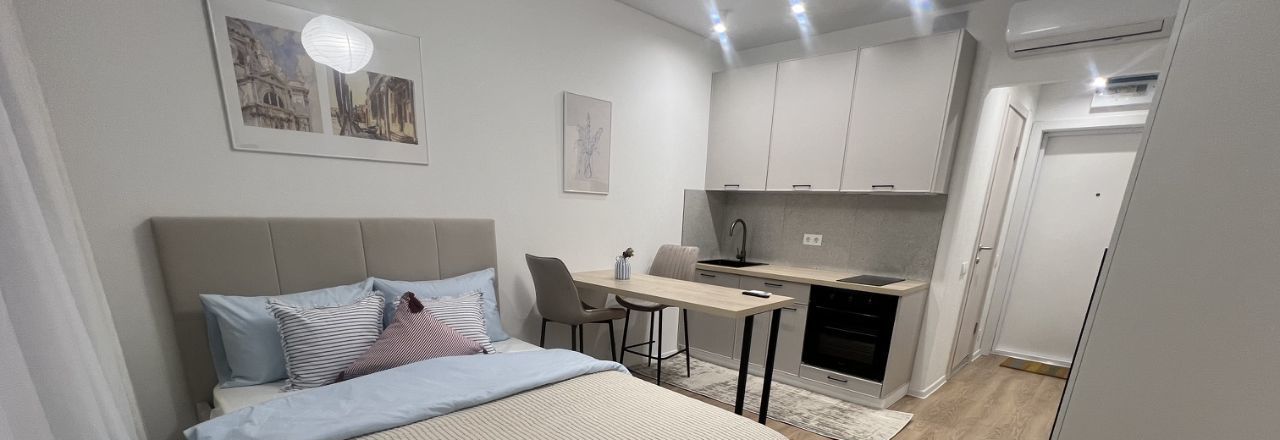 Сдается студия с современным евро ремонтом в монолитном доме 2024 года постройки. В квартире выполнен свежий ремонт, стены и полы выполнены в светлых тонах, что создает ощущение простора и уюта. Просторная кухня оборудована всей необходимой техникой: холодильник, плита, духовой шкаф и вытяжка, кондиционер. Из мебели — вместительные шкафы, Кровать с подъемным механизмом. Развитая инфраструктура, рядом лес, метро. Квартира свободна. Залог разбивается на две части .