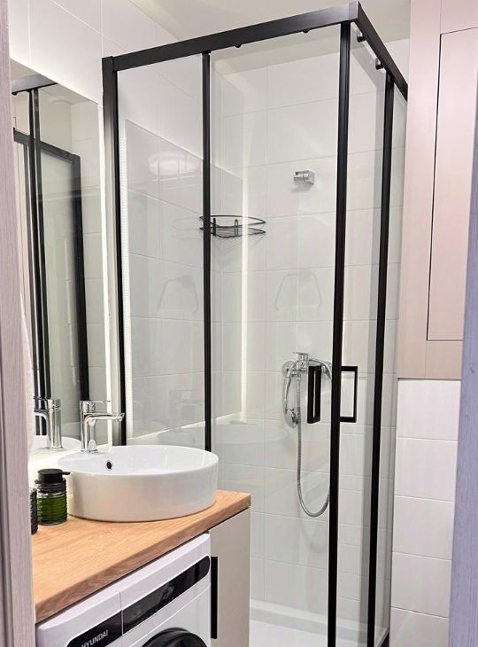 Техника: кондиционер, встроенный холодильник, посудомоечная машина и стиральная с функцией сушки вещей, микроволновая печь, пылесос, утюг, гладильная доска-лестница, швабра. Санузел с душевой кабиной.