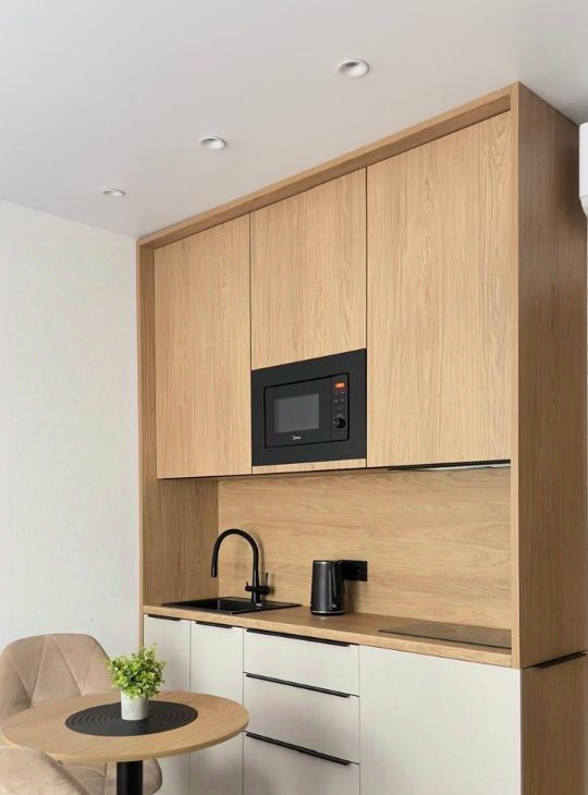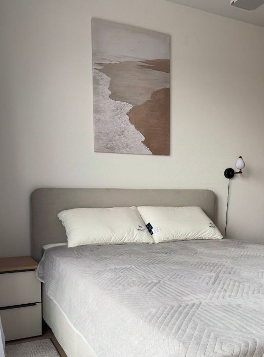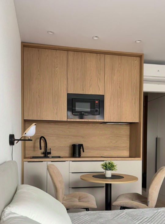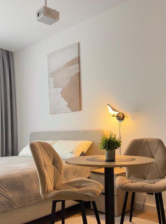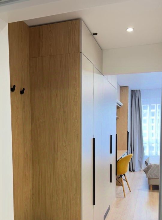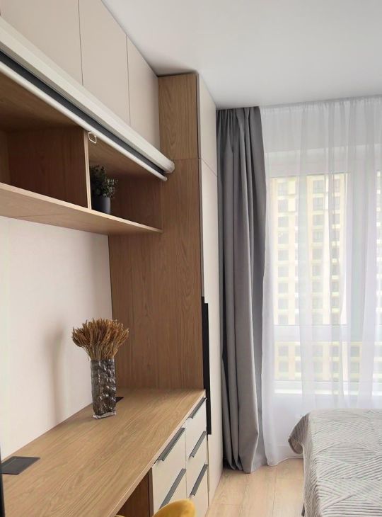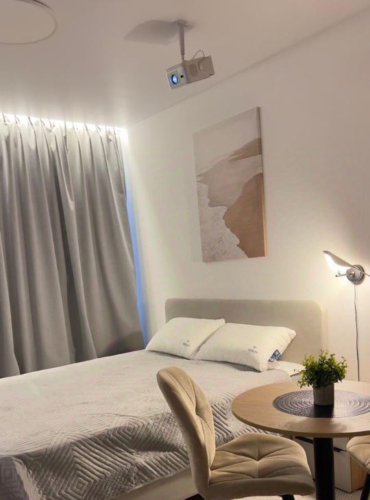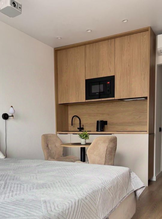 Площадь 20 м². Качественная мебель выполнена на заказ, много систем хранения для комфортного проживания двух человек. Полноценная двуспальная кровать (160х200см), с ортопедическим двусторонним матрасом (Аскона) и подъемным механизмом с системой хранения. Вместо телевизора — проектор. Полный комплект премиальных отельных постельных принадлежностей - Хилтон: одеяло, подушки, постельное белье, полотенца. Есть вся необходимая посуда.